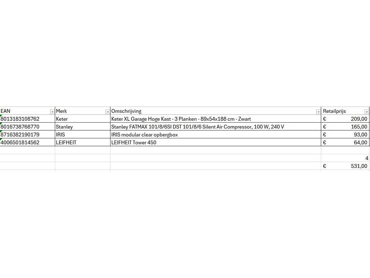 Dit betreft een partij A-merk retourgoederen van een grote online retailer. De partij bestaat uit diverse productcategorieën. Aantal stuks: 4. Retailwaarde: €531,- Ongecontroleerd: werking onbekend (mix van werkend, incompleet, beschadigd, te gebruiken voor onderdelen). Kom op de kijkdag om te om zo een goed beeld te krijgen van de reden van retour. Zie foto's voor lijst met inhoud. Bezorgtermijn 14 dagen Merk: Pallet Retourgoederen