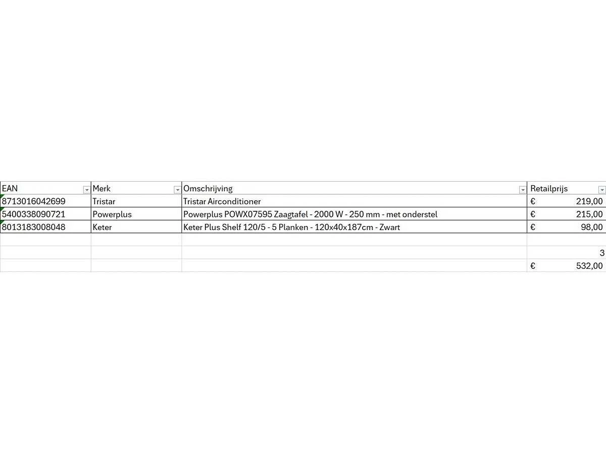 Dit betreft een partij A-merk retourgoederen van een grote online retailer. De partij bestaat uit diverse productcategorieën. Aantal stuks: 3. Retailwaarde: €532,- Ongecontroleerd: werking onbekend (mix van werkend, incompleet, beschadigd, te gebruiken voor onderdelen). Kom op de kijkdag om te om zo een goed beeld te krijgen van de reden van retour. Zie foto's voor lijst met inhoud. Bezorgtermijn 14 dagen Merk: Pallet Retourgoederen