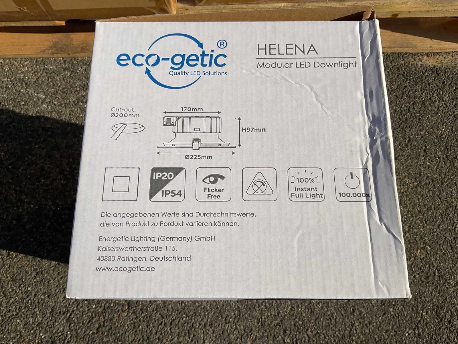 De Eco-Getic Helena is een modulaire LED downlight, ontwikkeld voor efficiënte en flexibele verlichting. Vermogen: schakelbaar tussen 19,5W en 25W. Lichtopbrengst: 1860–2500 lumen (3000K) / 2000–2700 lumen (4000K). Lichtkleur: omschakelbaar tussen warmwit (3000K) en neutraal wit (4000K). Uitstraalhoek: 90° voor brede, gelijkmatige verlichting. Kleurweergave: Ra >80 voor natuurgetrouwe kleurweergave. Behuizing: mat wit (WH26), moderne uitstraling. Inbouwmaat (cut-out): Ø200 mm. Afmetingen: Ø225 mm x H97 mm. Beschermingsklasse: IP20/IP54 (geschikt voor binnenruimtes, spatwaterdicht aan voorzijde). Eenvoudige Installatie met doorlussing (in-out bedrading). Let op: deze kavel betreft een voorraad van 192, deze is verdeeld in 8 dozen met 24 stuks. Merk: Eco-getic Model: Helena Product type: inbouwspot Met lichtbron: true Fitting: nvt Wattage: 19,5-25W Lichtbron: LED Kleurtemperatuur: 3000-4000 Kleur: wit Lengte: 22,5cm Breedte: 22,5cm Hoogte: 9,7cm Materiaal: aluminium, kunststof