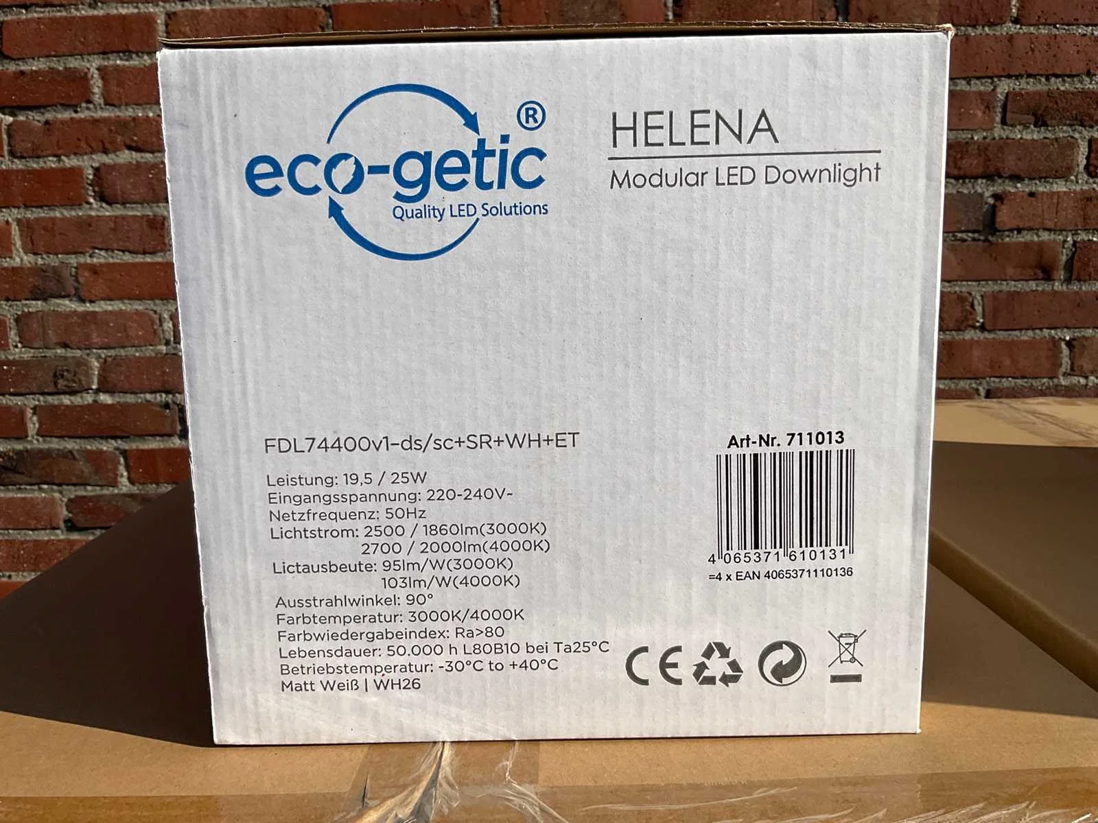 De Eco-Getic Helena is een modulaire LED downlight, ontwikkeld voor efficiënte en flexibele verlichting. Vermogen: schakelbaar tussen 19,5W en 25W. Lichtopbrengst: 1860–2500 lumen (3000K) / 2000–2700 lumen (4000K). Lichtkleur: omschakelbaar tussen warmwit (3000K) en neutraal wit (4000K). Uitstraalhoek: 90° voor brede, gelijkmatige verlichting. Kleurweergave: Ra >80 voor natuurgetrouwe kleurweergave. Behuizing: mat wit (WH26), moderne uitstraling. Inbouwmaat (cut-out): Ø200 mm. Afmetingen: Ø225 mm x H97 mm. Beschermingsklasse: IP20/IP54 (geschikt voor binnenruimtes, spatwaterdicht aan voorzijde). Eenvoudige Installatie met doorlussing (in-out bedrading). Let op: deze kavel betreft een voorraad van 152, deze is verdeeld in 6 dozen met 24 stuks én 2 dozen van 4 stuks. Merk: Eco-getic Model: Helena Product type: inbouwspot Met lichtbron: true Fitting: nvt Wattage: 19,5-25W Lichtbron: LED Kleurtemperatuur: 3000-4000 Kleur: wit Lengte: 22,5cm Breedte: 22,5cm Hoogte: 9,7cm Materiaal: aluminium, kunststof