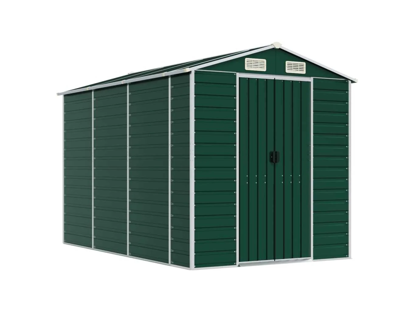 Breid je tuinopbergmogelijkheden uit en bescherm je gereedschap met deze multifunctionele tuinschuur. Robuust materiaal: het tuinschuurtje is gemaakt van gegalvaniseerd staal, dat roestvorming voorkomt en lang meegaat. Staal is een buitengewoon hard en sterk materiaal. Het biedt stevigheid en stabiliteit. Galvanisatie biedt een betere bescherming tegen corrosie en is handig voor producten die buiten of in ruwe omgevingen worden gebruikt. Voldoende opbergruimte: deze metalen schuur biedt voldoende ruimte om je brandhout, tuingereedschap, meubels, uitrusting en meer in op te bergen. Handige handgrepen: de deur van de opbergschuur is voorzien van handgrepen voor gemakkelijke toegang. Goede ventilatie: de berging heeft 4 ventilatieopeningen die zorgen voor ventilatie, om de ophoping van vocht en geurtjes in de schuur te verminderen. Schuin ontwerp: dankzij het schuine dak loopt water er ongehinderd vanaf. Kenmerken Kleur: groen Materiaal: gegalvaniseerd staal Totale afmetingen: 191 x 300 x 198 cm (B x D x H) Afmetingen deur: 80 x 170 cm (B x H) Merk: vidaXL Model: zadeldak Product type: tuinhuis Kleur: donkergroen Gewicht: 120kg Lengte: 300cm Breedte: 191cm Hoogte: 198cm Materiaal: Verzinkt-gespoten staal