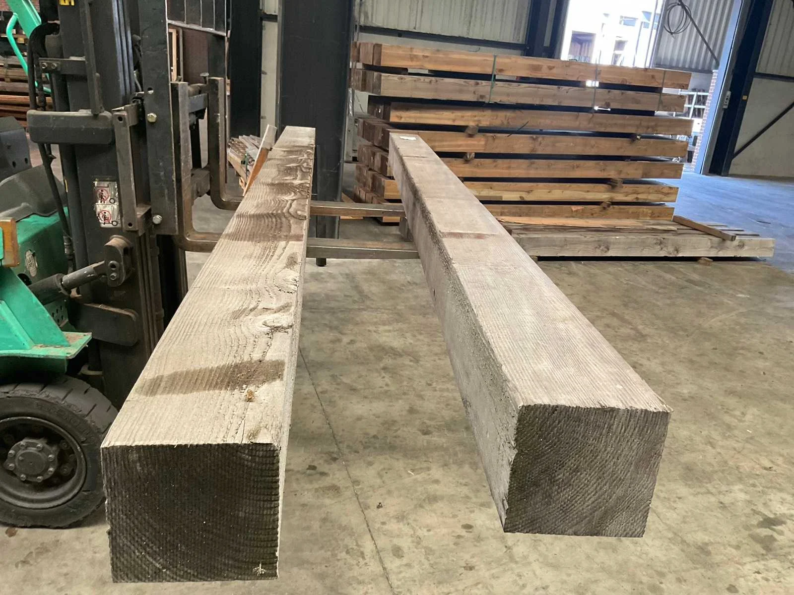 Douglas tuinpaal 400x20x20 cm, zie foto's voor details. Houtsoort: Douglas Breedte: 200mm Hoogte: 200mm Kopmaat: 200x200 Gewicht: 200kg Totale afmeting Breedte: 4000mm