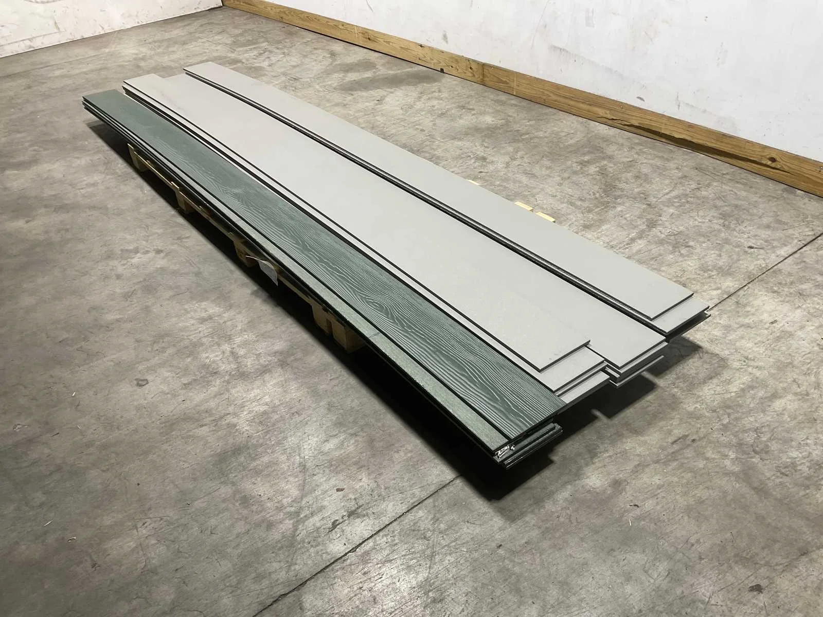 Partij vezelcementstroken van Lap Wood en Lap Smooth. Groen en grijs. Zie foto's voor details. 3600x186x12 mm Merk: Cedral Model: Lap Wood/Smooth Product type: Gevelstrook Lengte: 360cm Breedte: 18.6cm Hoogte: 1.2cm Materiaal: Cementvezel