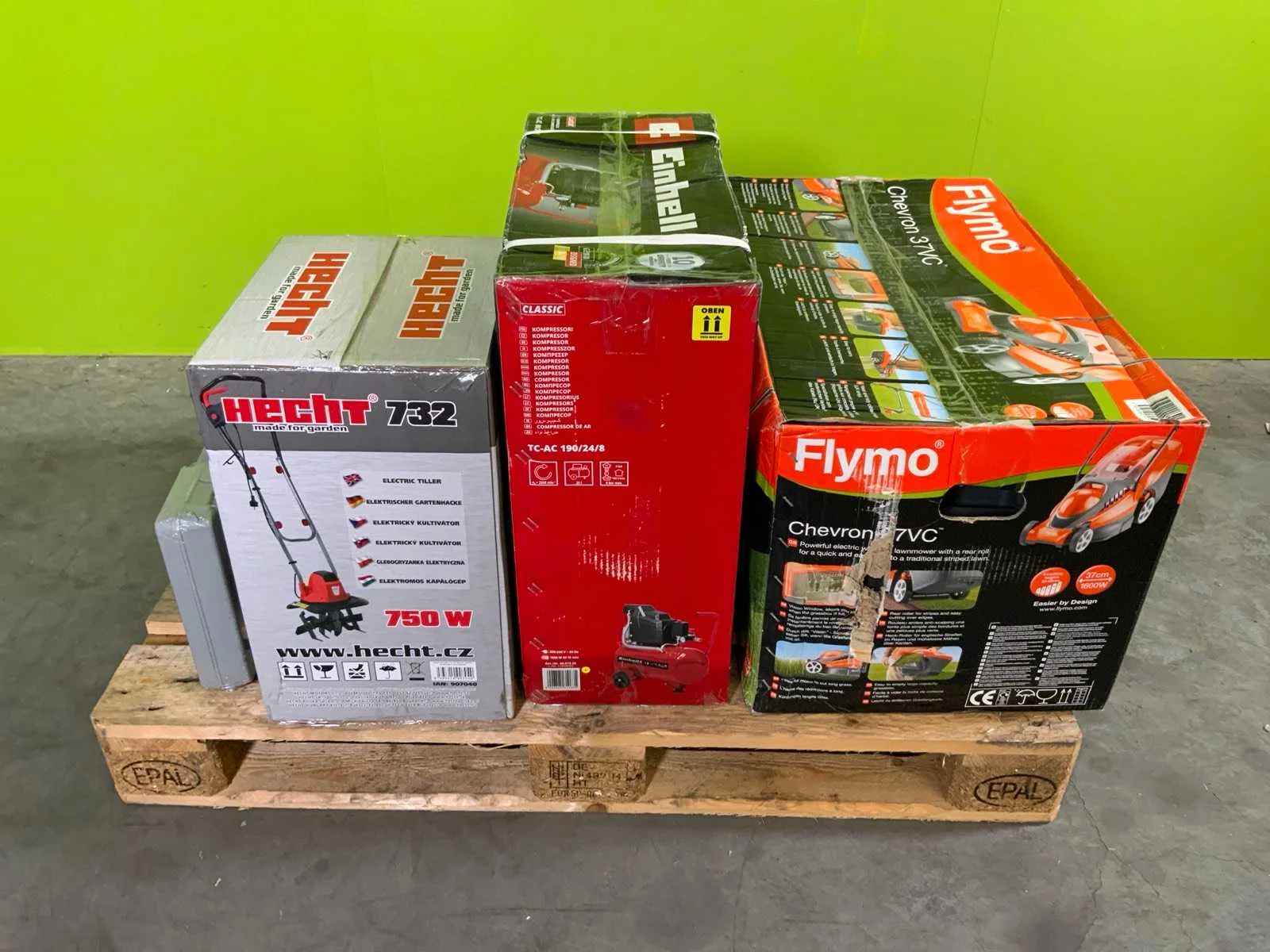 Bestaande uit: Flymo Chevron 37VC elektrische grasmaaier, 1x Einhell TC-AC 190/24/8 compressor, 1x Hecht 732 elektrische cultivator, 1x Hecht 1138 elektrische beton mixer, 1x Güde MW 18-201-30K accu multitool en 1x GS 100-delige gereedschapsset.