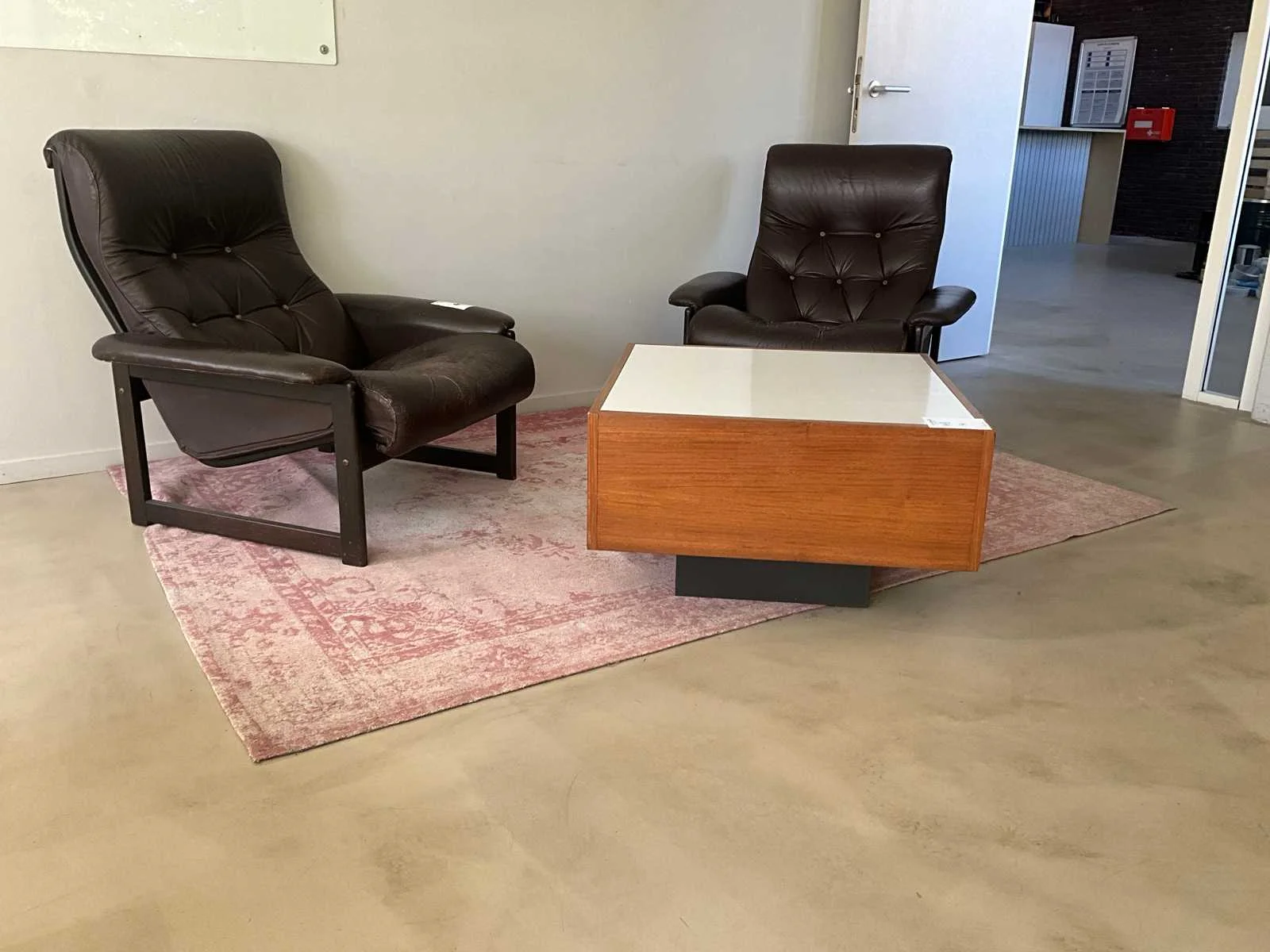 Bestaande uit: 2x fauteuil, 1x tafel 70x70x42cm, 1x vloerkleed 230x160