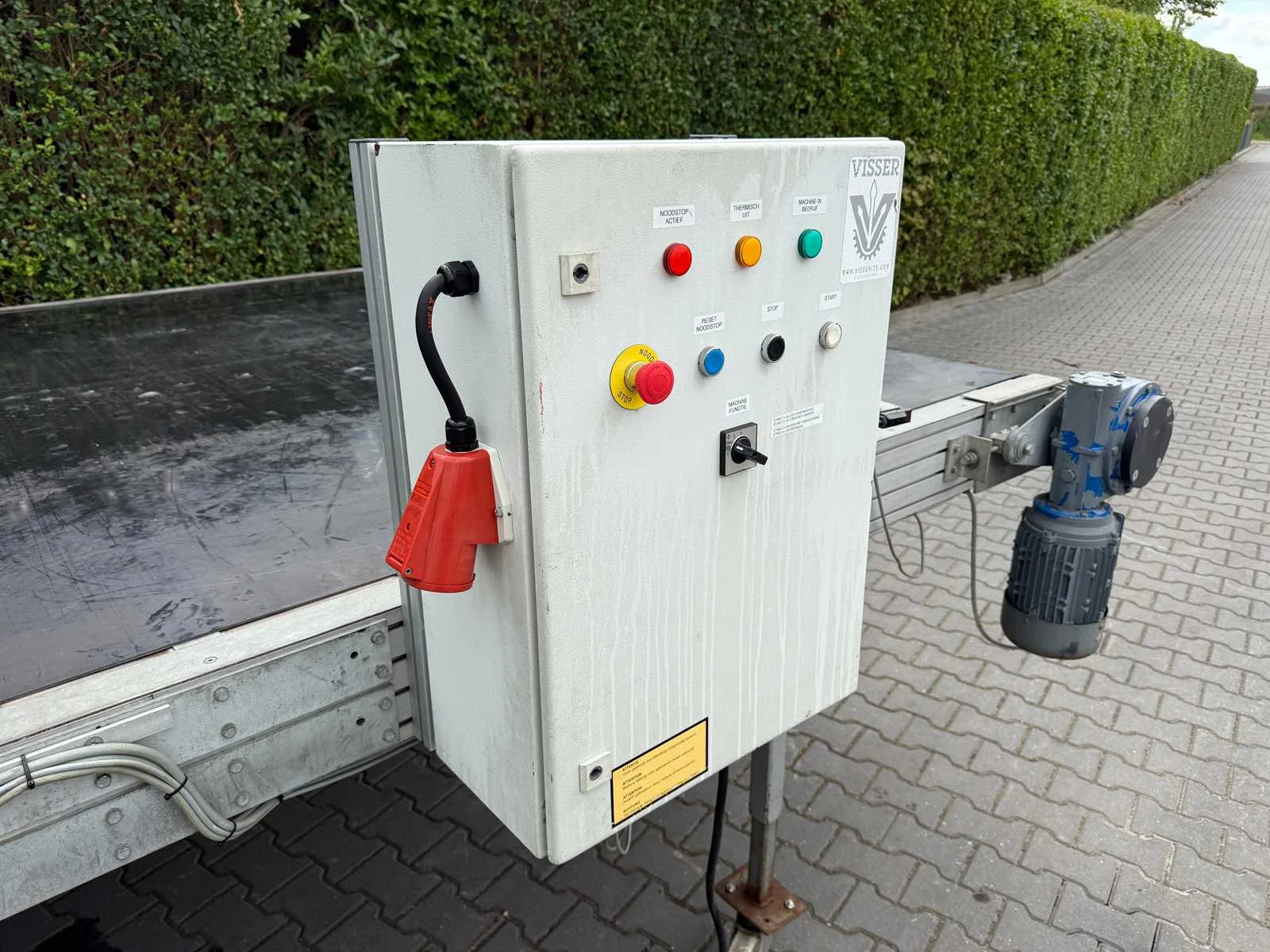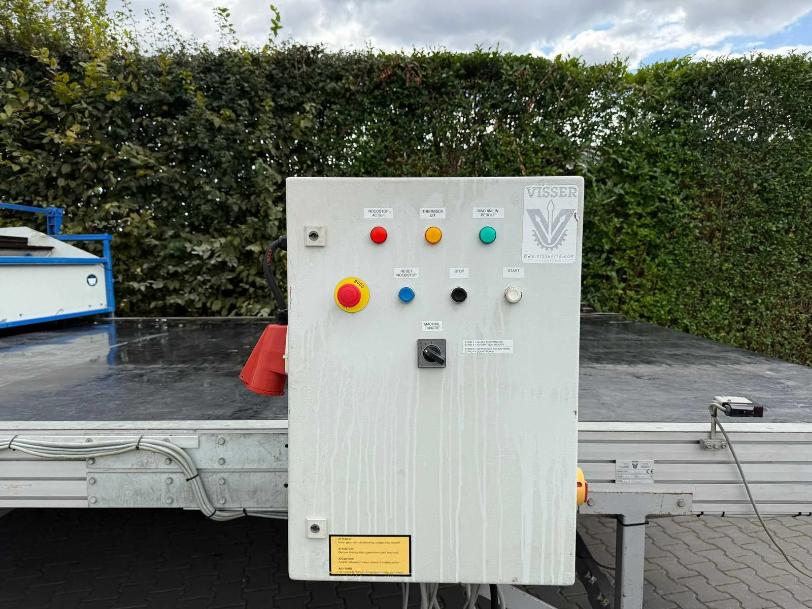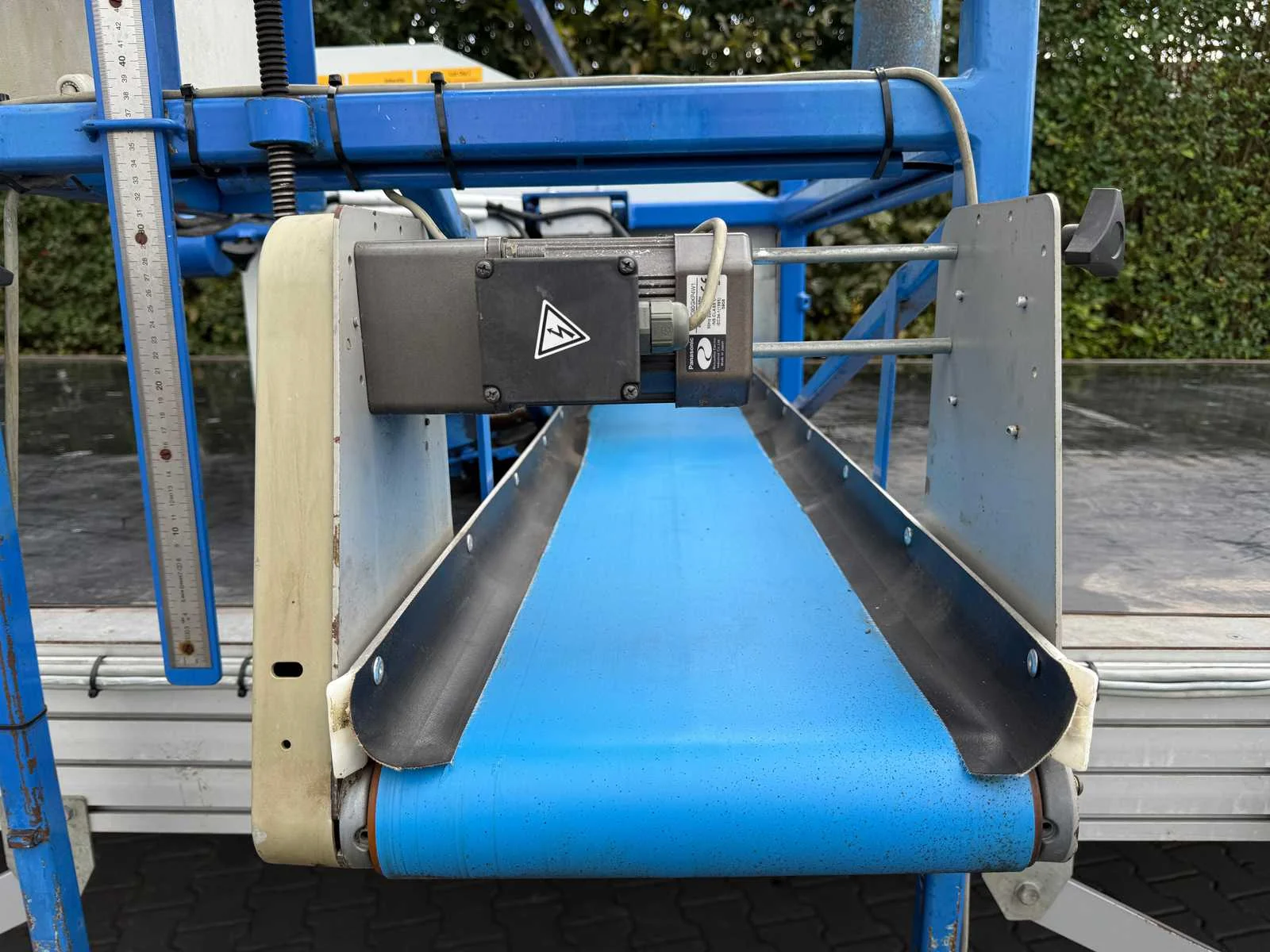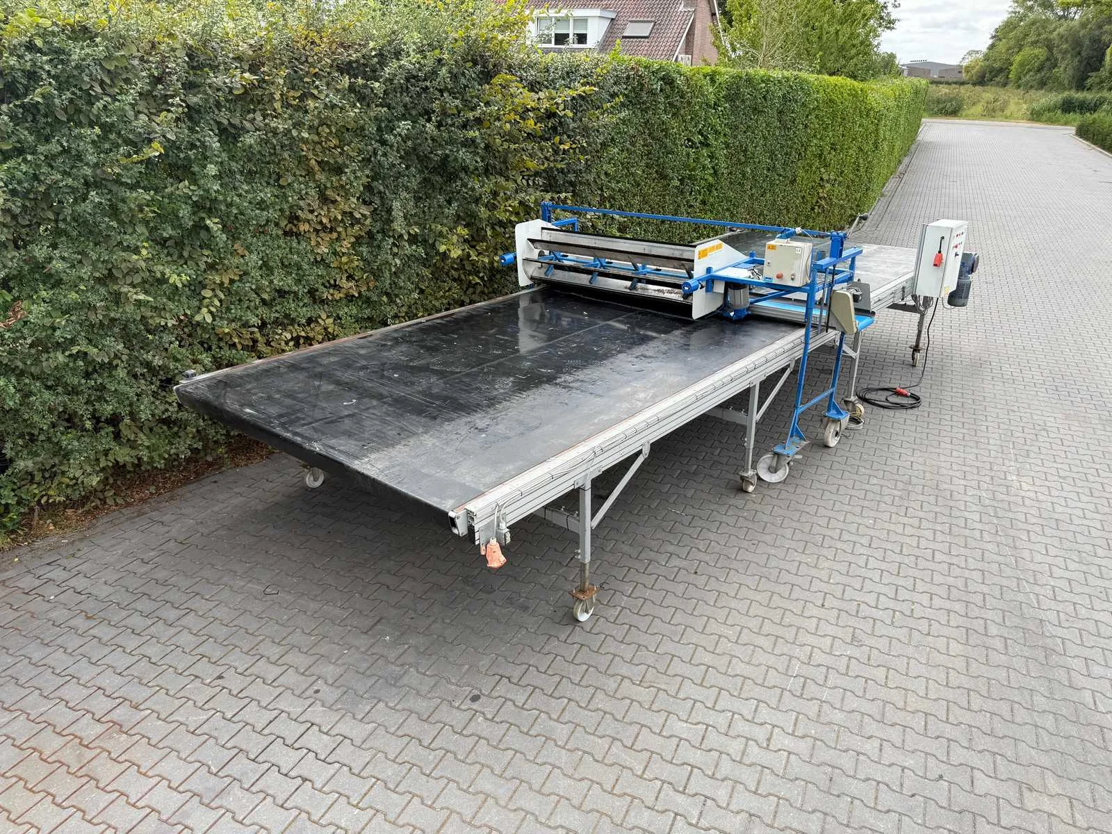 Bandbreedte: 2625mm, voorzien van: Voets stekkenknipper met borstel, (werkbreedte 2000mm, transportband 3150x320mm, regelbare snelheid), in hoogte verstelbaar, Merk: Visser Type: Brede Vitra Bouwjaar: 2006 Serienummer: 96238-40 Aansluiting: 400V Eigen gewicht: 850kg Totale afmeting L: 8000mm Totale afmeting Breedte: 3080mm Totale afmeting Hoogte: 1150mm Leveringsvoorwaarden: Heftruck aanwezig op locatie!