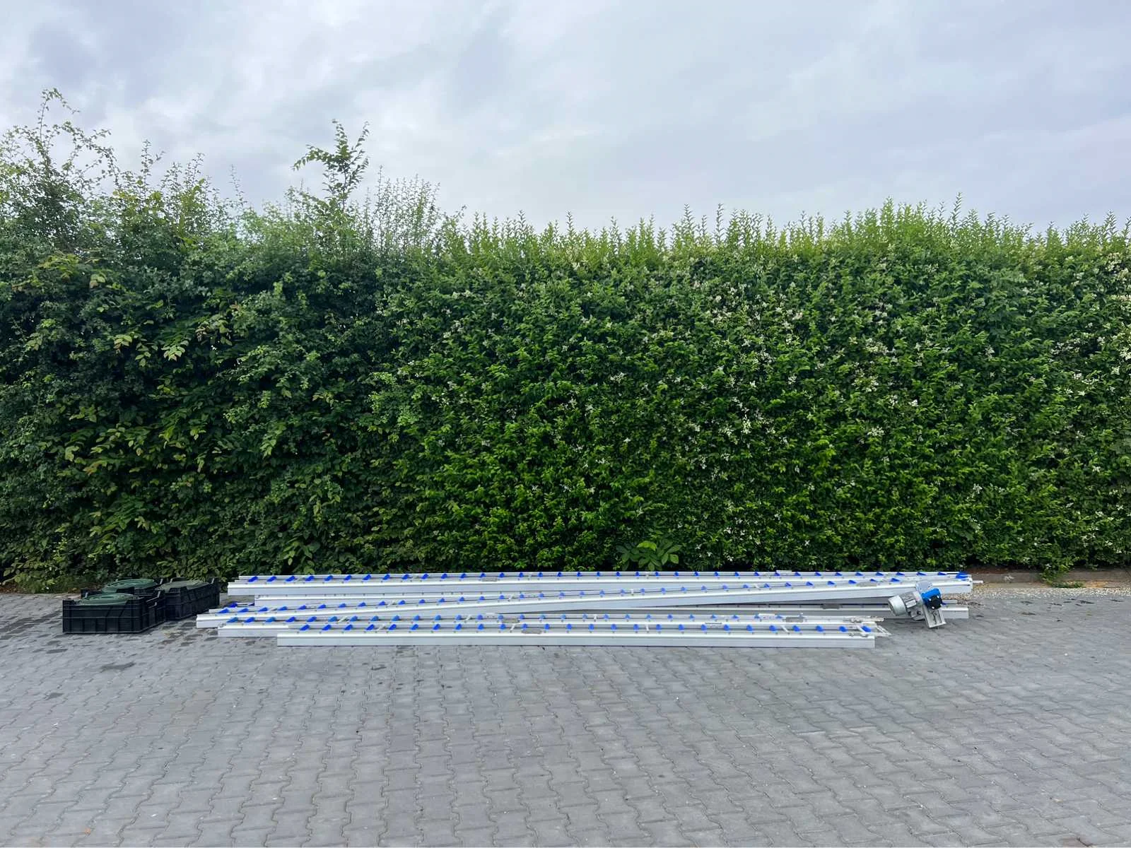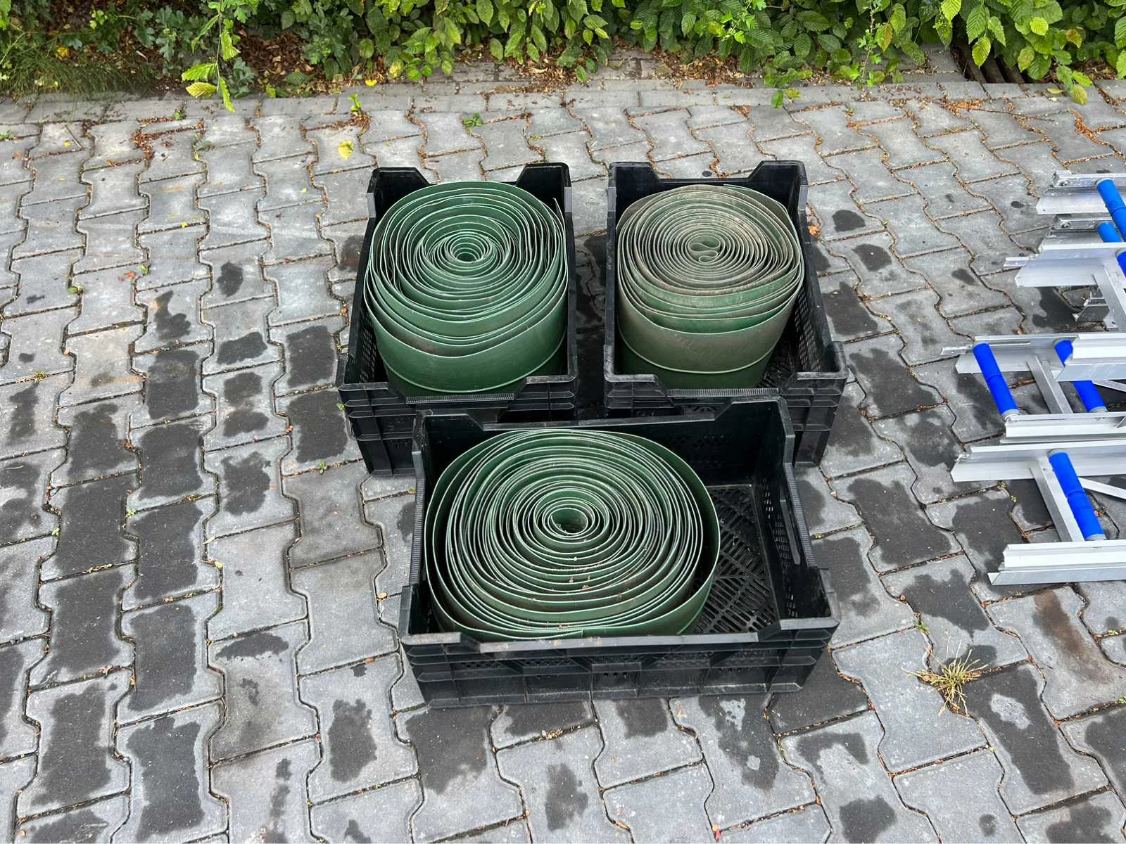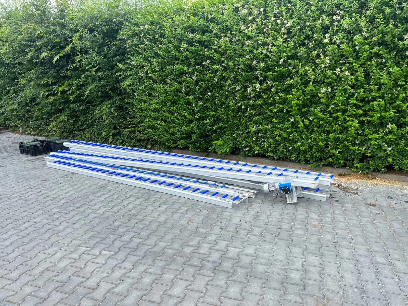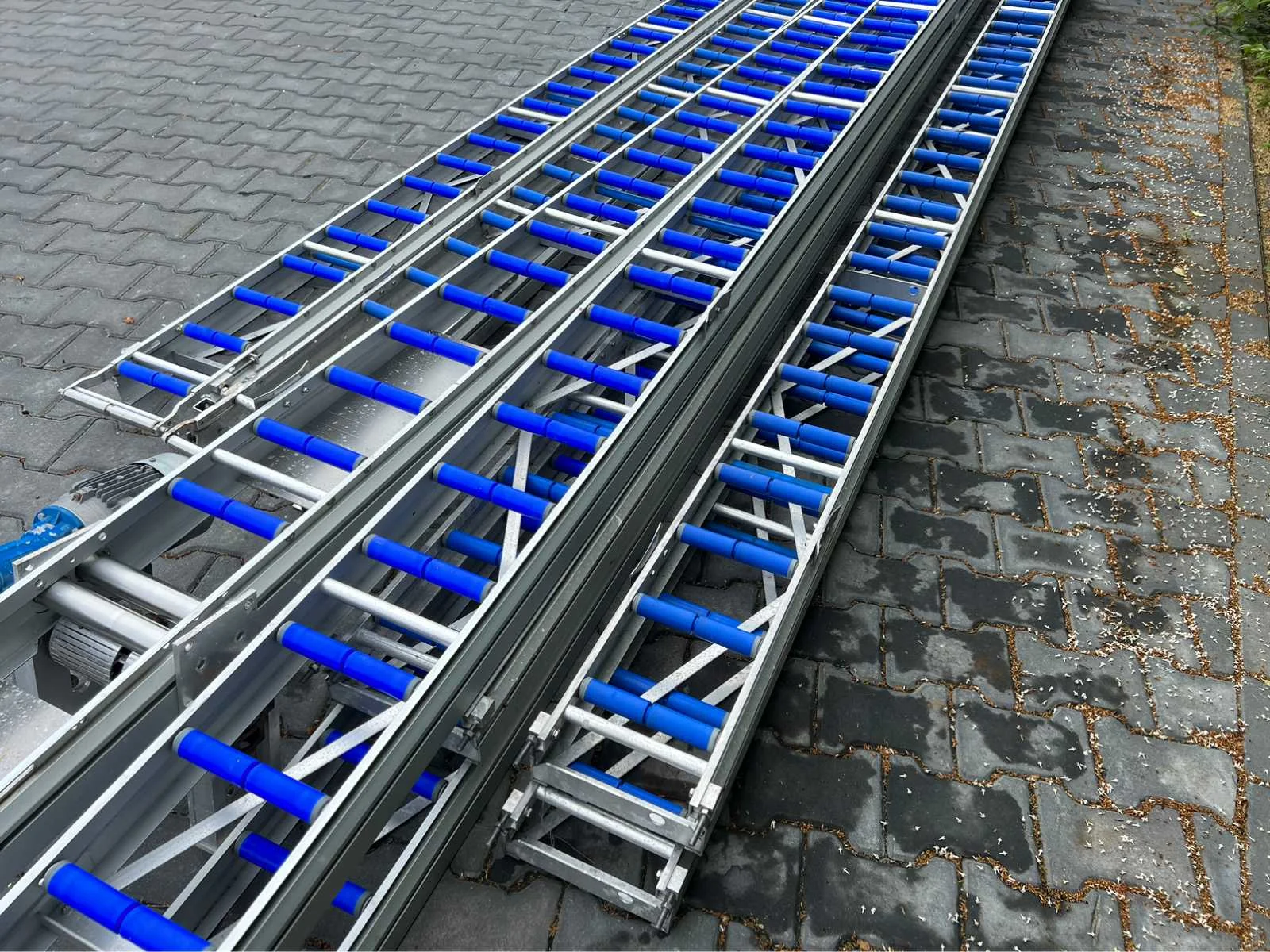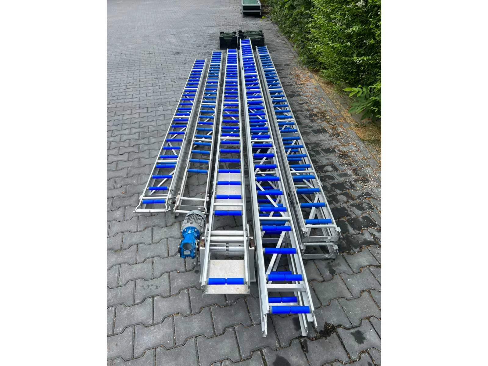 Band is gedemonteerd; baan breedte 20 cm; totale lengte circa 41500 mm; geheel compleet met banddek Merk: Wevab Aansluiting: 400V
