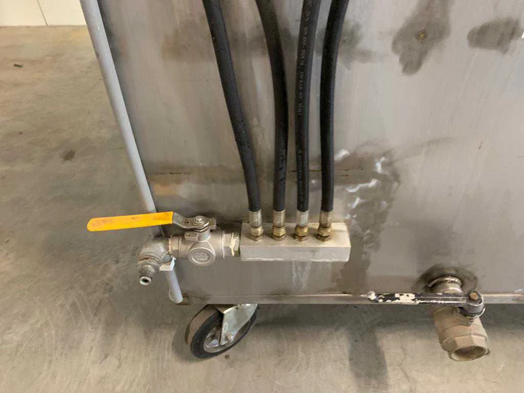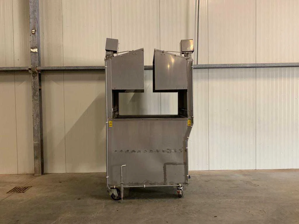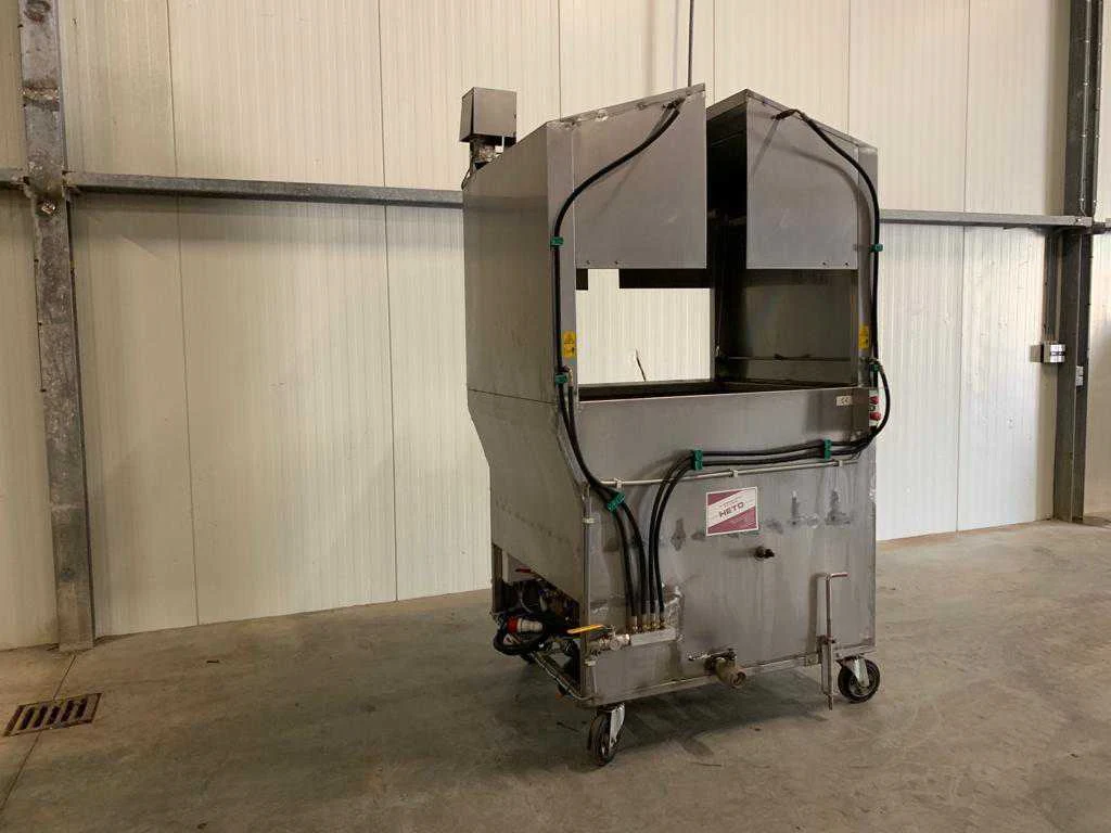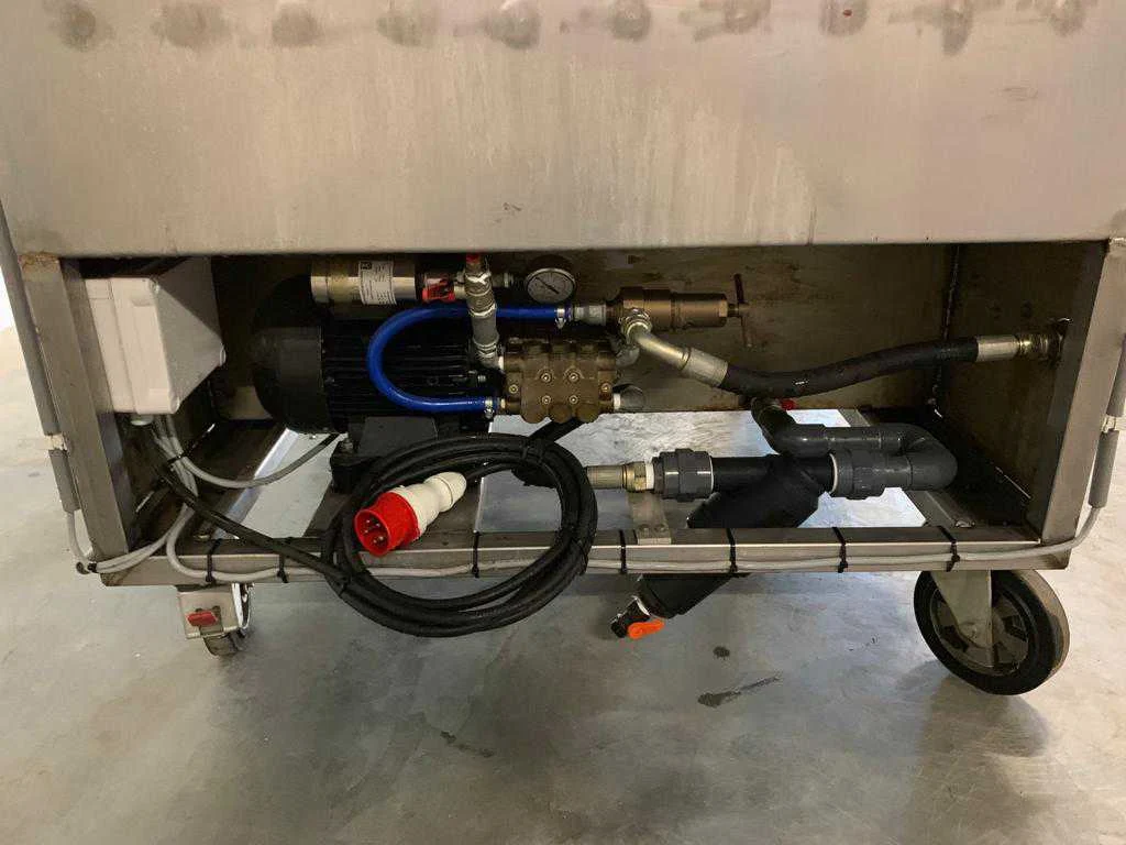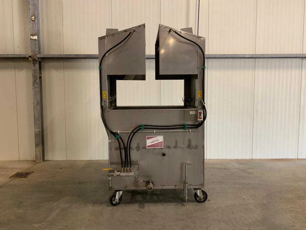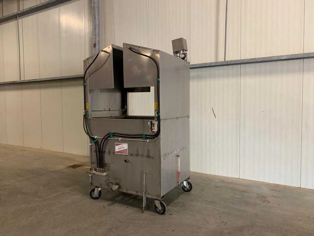 Hogedruk pomp; 2 beweegbare nozzles; hoogte invoer 1400 mm; invoer breedte 1300 mm, 16A 5-polige stekker, geheel rvs, massief rubberen wielen Merk: Heto Aansluiting: 400V Totale afmeting L: 1300mm Totale afmeting Breedte: 1600mm Totale afmeting Hoogte: 2600mm