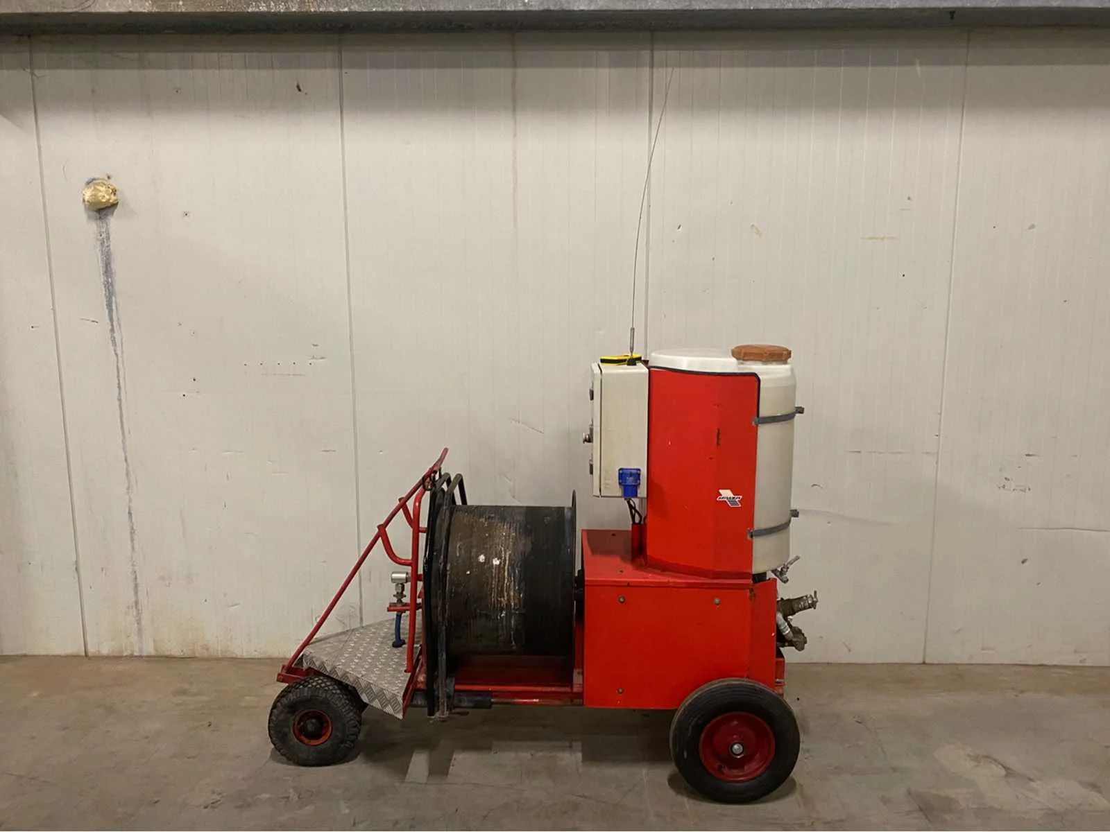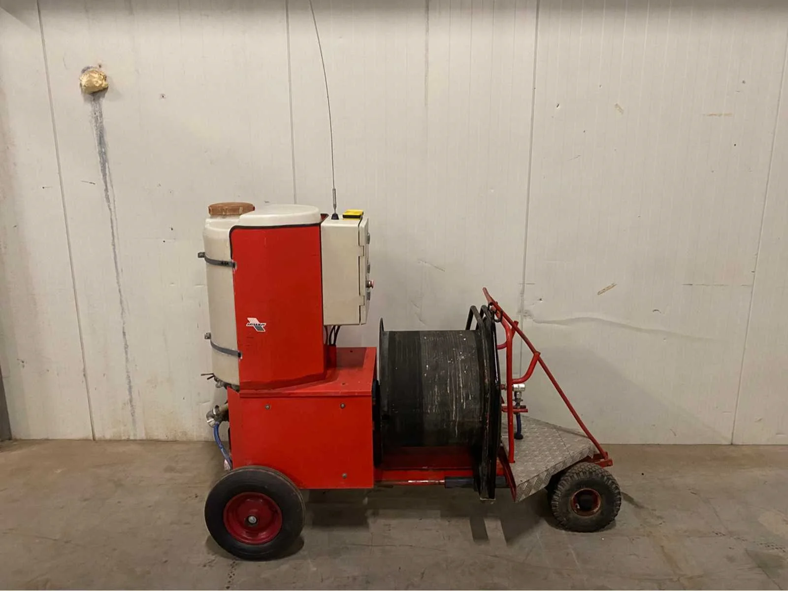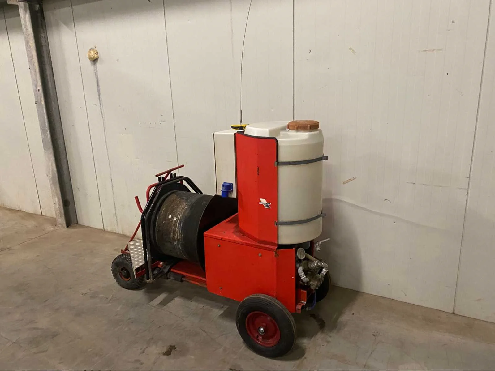 Voorzien van haspel met plunjerpomp,slangenbegeleiding , volume inhoud: 80 liter ,zender aanwezig, Totaal afmeting: L 1700 x B 750 x H 1350 mm Merk: Brinkman Diameter ca.: 600mm