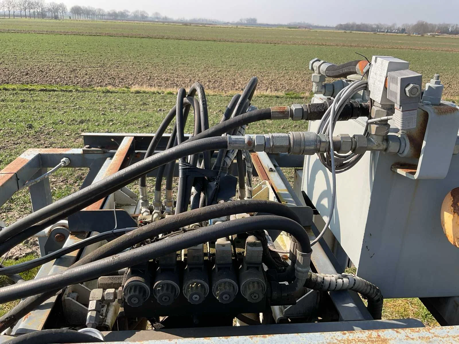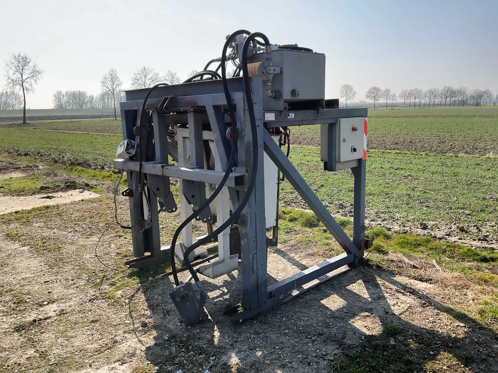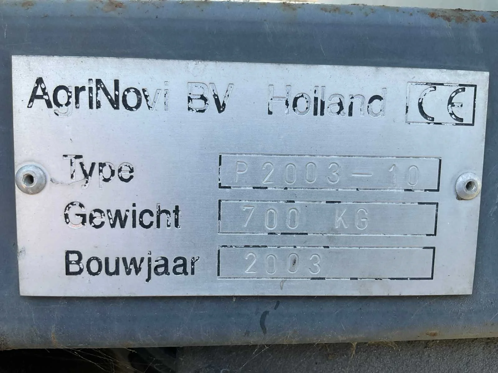 Frame op glijsloffen, 3 punts inrichting, eigen aftakas pomp, elektrisch hydraulische bediening, X/Y/Z as bediening, 100mm brede geleider doorgang, Merk: AgriNova Type: P2003-10 Bouwjaar: 2003 Aansluiting: 12V Eigen gewicht: 700kg Totale afmeting L: 1900mm Totale afmeting Breedte: 1800mm Totale afmeting Hoogte: 2100mm