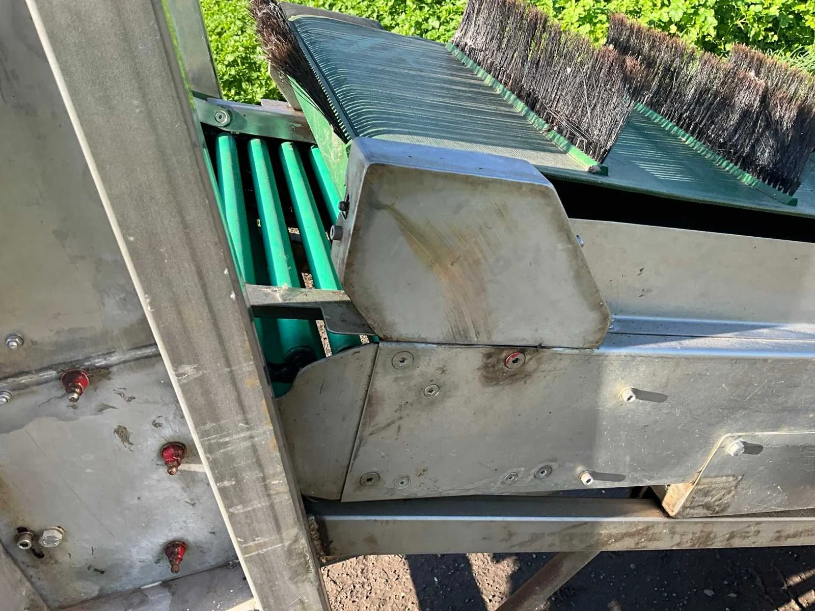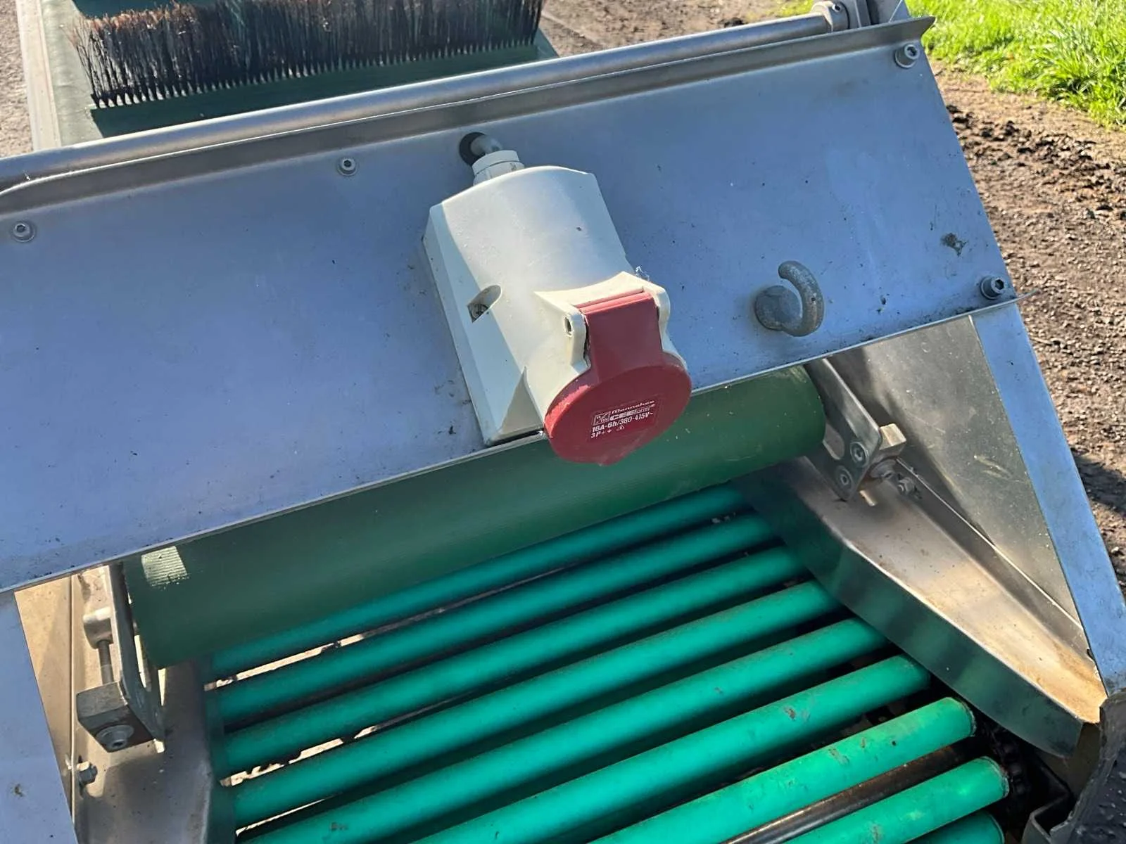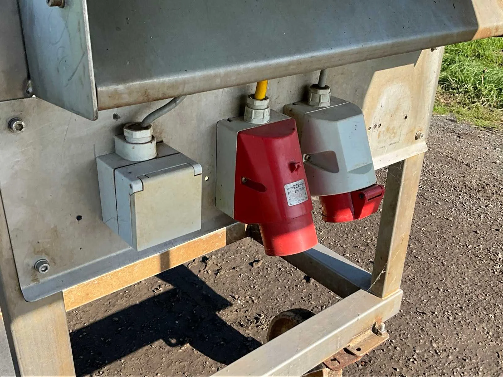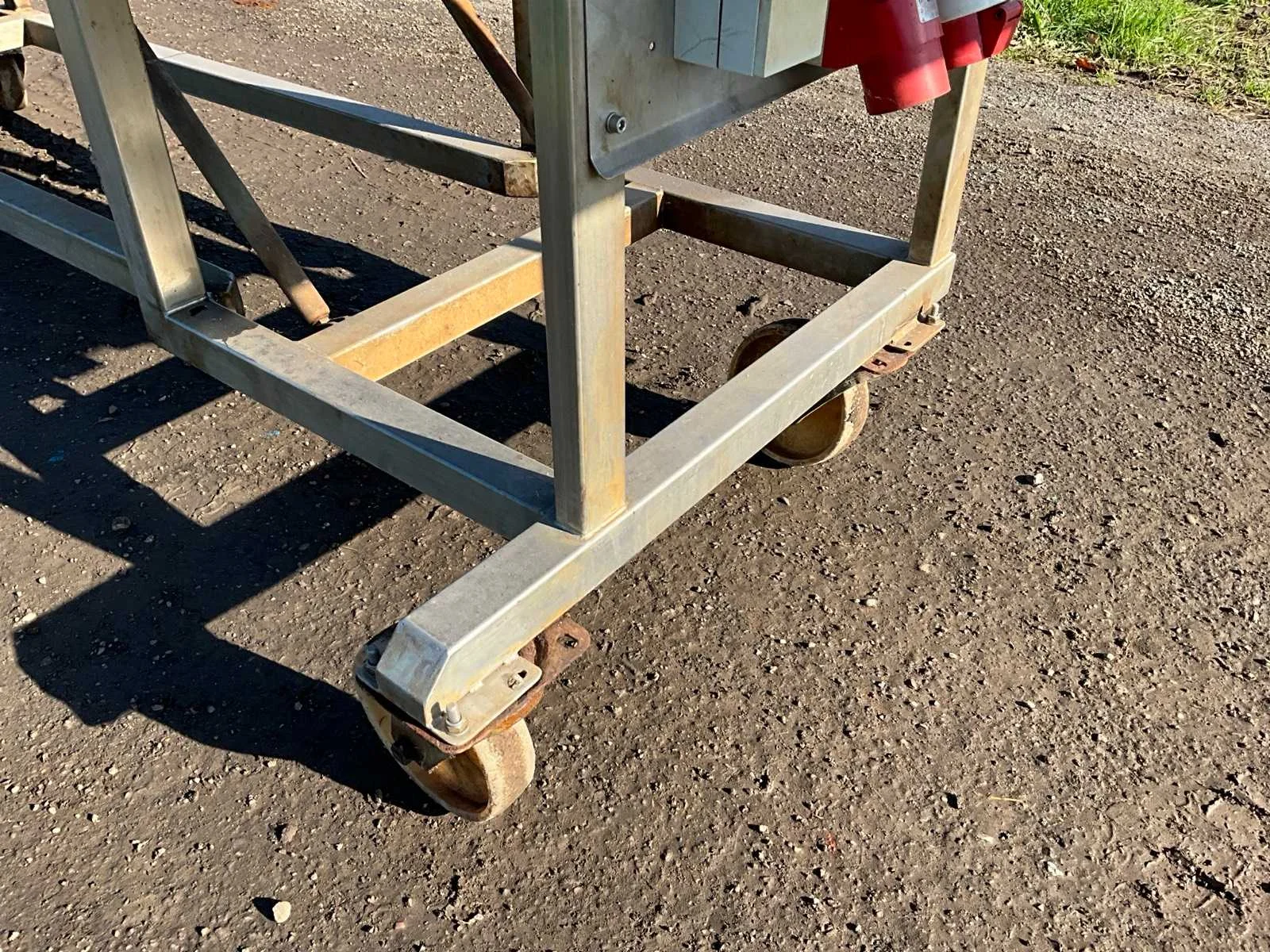 Bandbreedte 400mm, rollen 25mm doorsnee, borstelbaan, verrijdbaar, hoek verstelbaar, 400V 16A 5-polige stekker in, 2x 400V 16A 5-polige stekker uit, 230V stopcontact, RVS Lengte: 460cm Breedte: 80cm Hoogte: 150cm