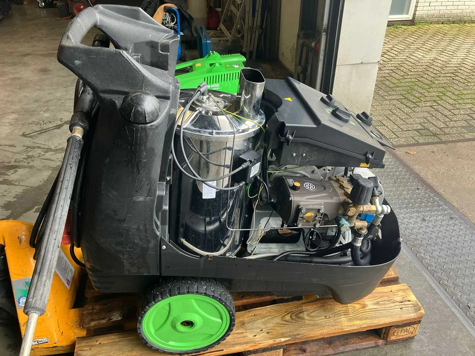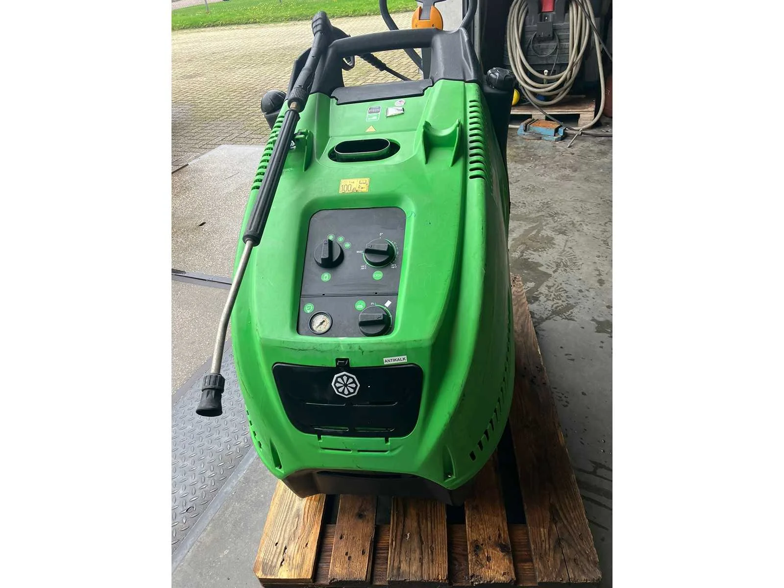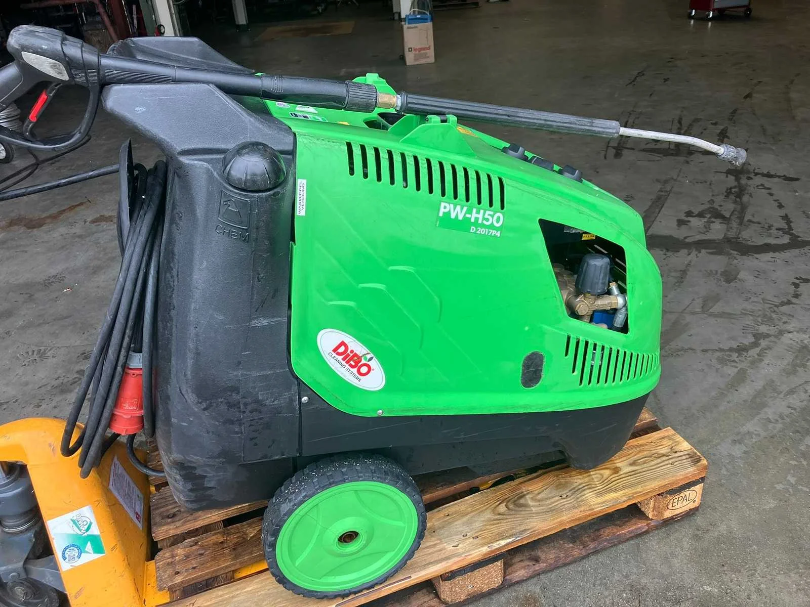 Werkt wel, maar heeft interne lekkage. Merk: Dibo Type: PW-H50 Maximale werkdruk: 275bar Temperatuurbereik max.: 140°c Dieselgestookt: true Aansluiting: 400V Eigen gewicht: 139kg