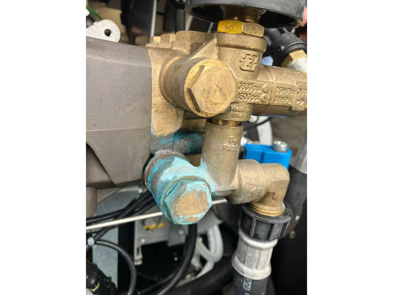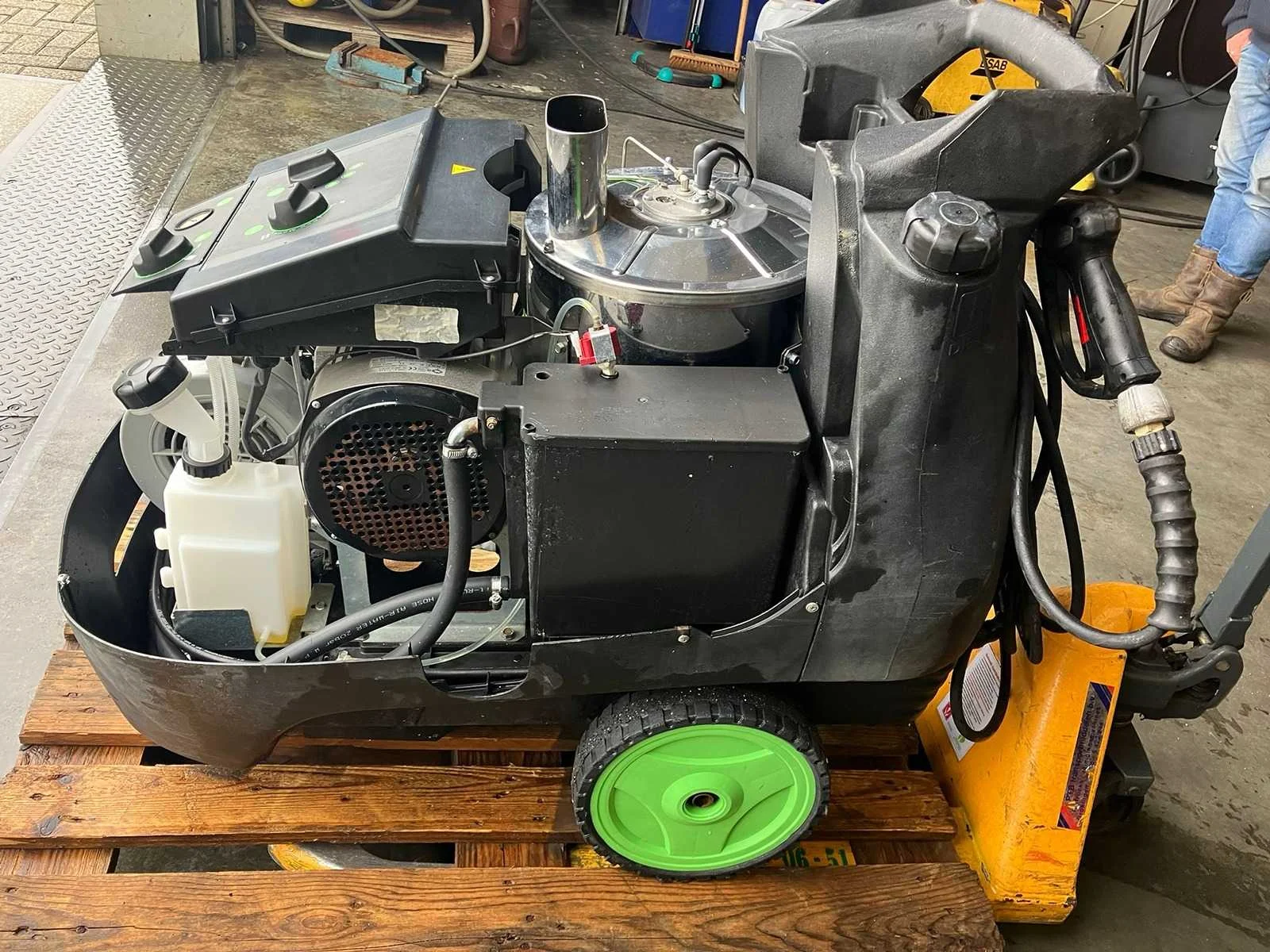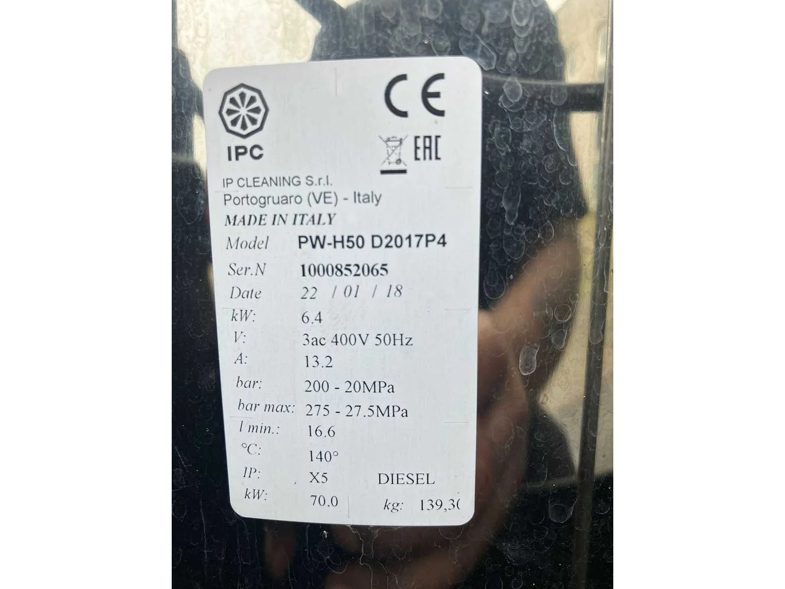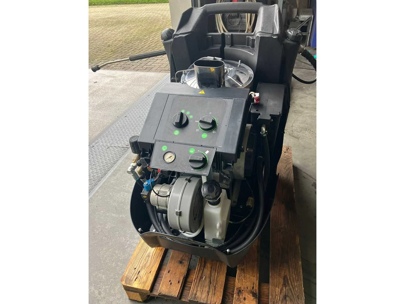 Werkt wel, maar heeft interne lekkage. Merk: Dibo Type: PW-H50 Maximale werkdruk: 275bar Temperatuurbereik max.: 140°c Dieselgestookt: true Aansluiting: 400V Eigen gewicht: 139kg