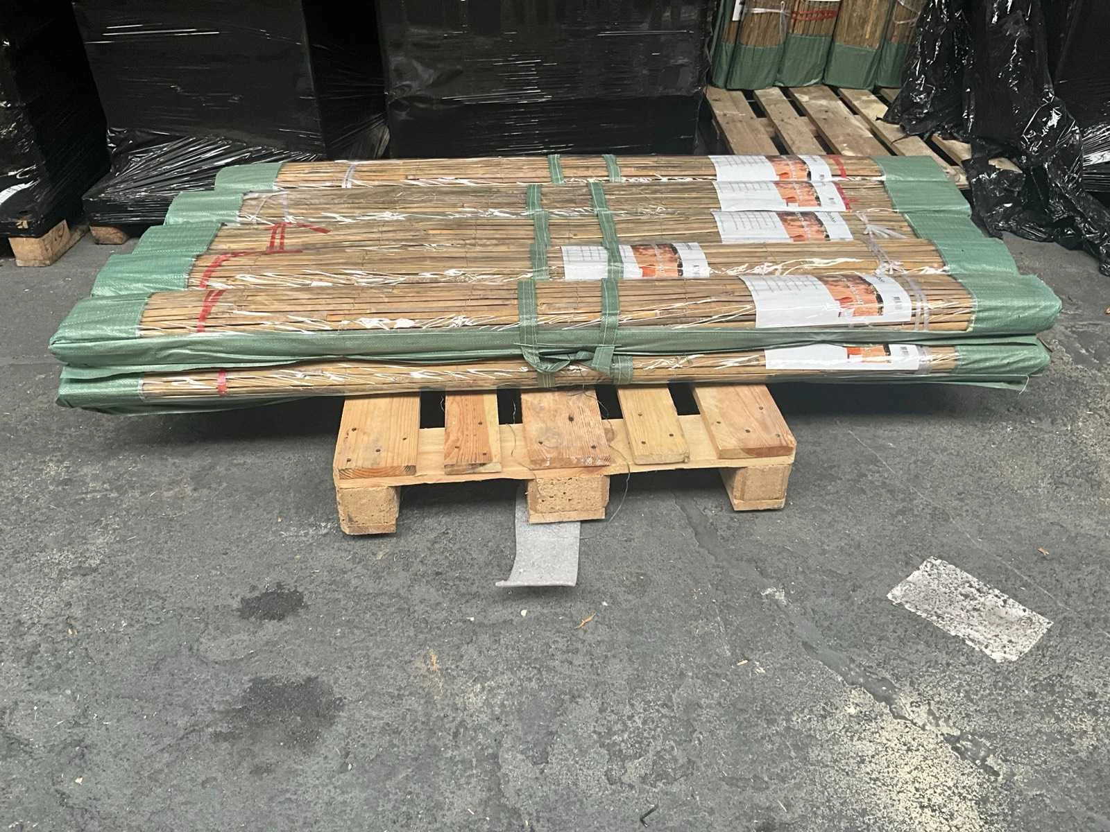 Categorie: Bamboe Matten Bamboesoort: Tonkin Latijnse naam: Pseudosasa amabilis Herkomst: China Diameter stokken: ≈ 1cm Kleur: Naturel Zichtdichtheid: 60%-80% Dikte: 40-60 mm Breedte: 3000 mm Hoogte: 1800 mm Montage: Gegalvaniseerd staaldraad Afwerking: Ongelakt Levensduur: 2-4 jaar 1 pallet bevat 10 stuks Merk: Bamboo Model: Mat gespleten- naturel- Tonkin Product type: 3000x1800 mm (54 m2)= 1 pallet Kleur: naturel Materiaal: Bamboe