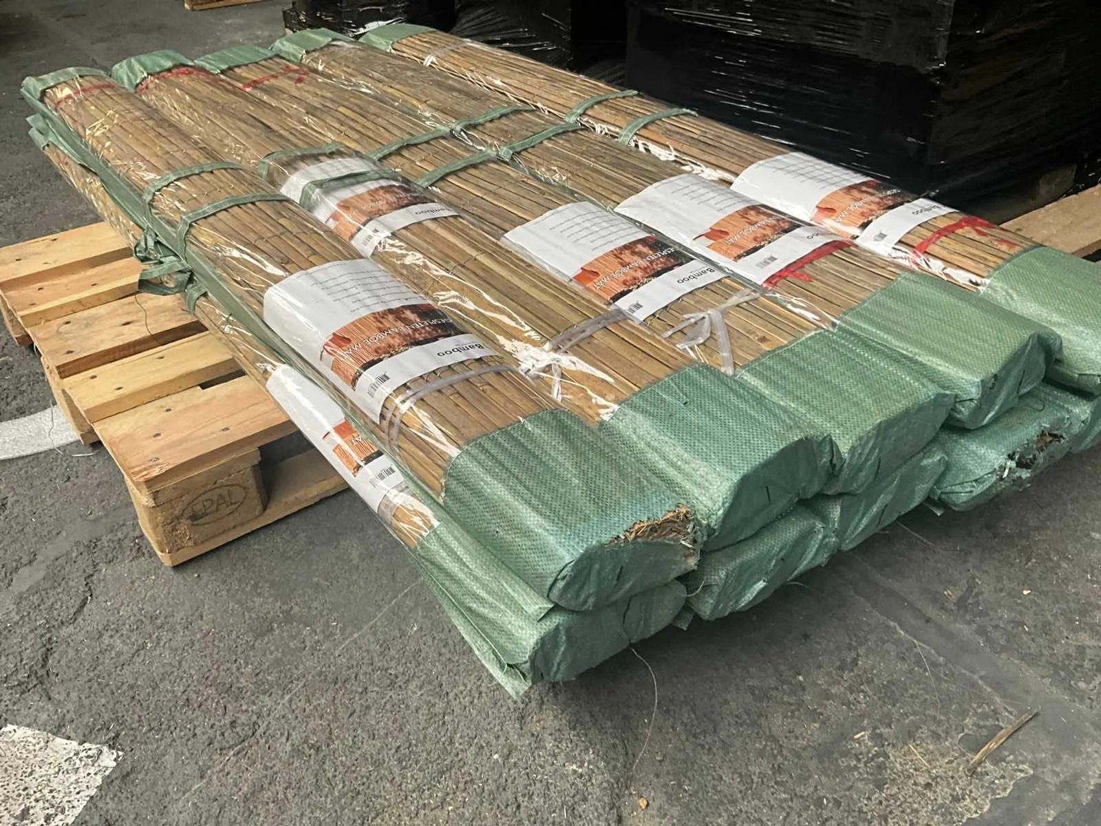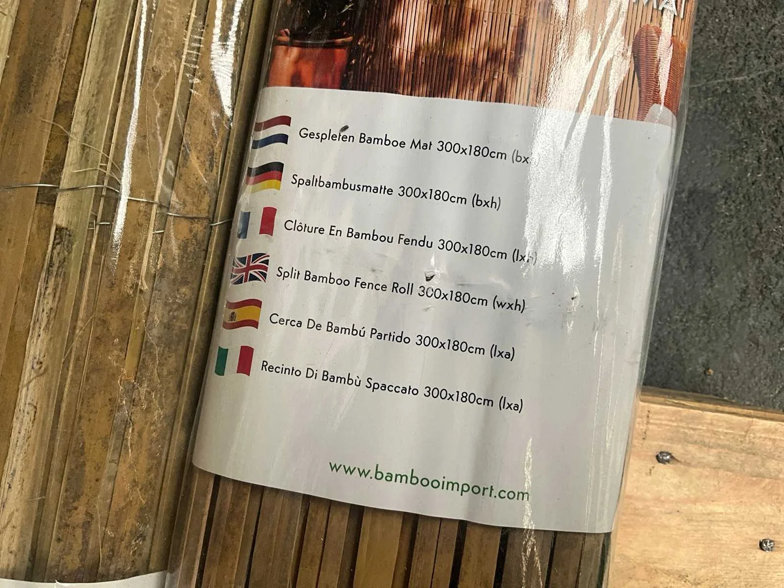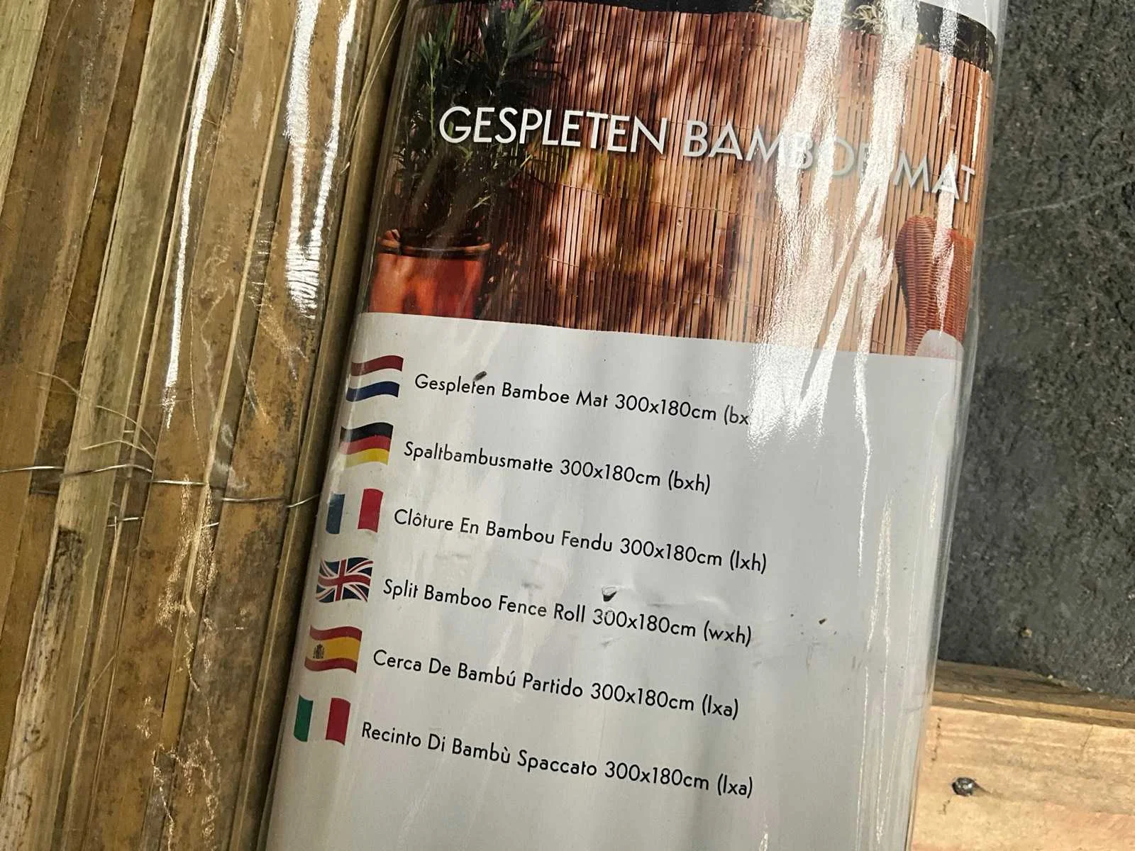 Categorie: Bamboe Matten Bamboesoort: Tonkin Latijnse naam: Pseudosasa amabilis Herkomst: China Diameter stokken: ≈ 1cm Kleur: Naturel Zichtdichtheid: 60%-80% Dikte: 40-60 mm Breedte: 3000 mm Hoogte: 1800 mm Montage: Gegalvaniseerd staaldraad Afwerking: Ongelakt Levensduur: 2-4 jaar 1 pallet bevat 10 stuks Merk: Bamboo Model: Mat gespleten- naturel- Tonkin Product type: 3000x1800 mm (54 m2)= 1 pallet Kleur: naturel Materiaal: Bamboe