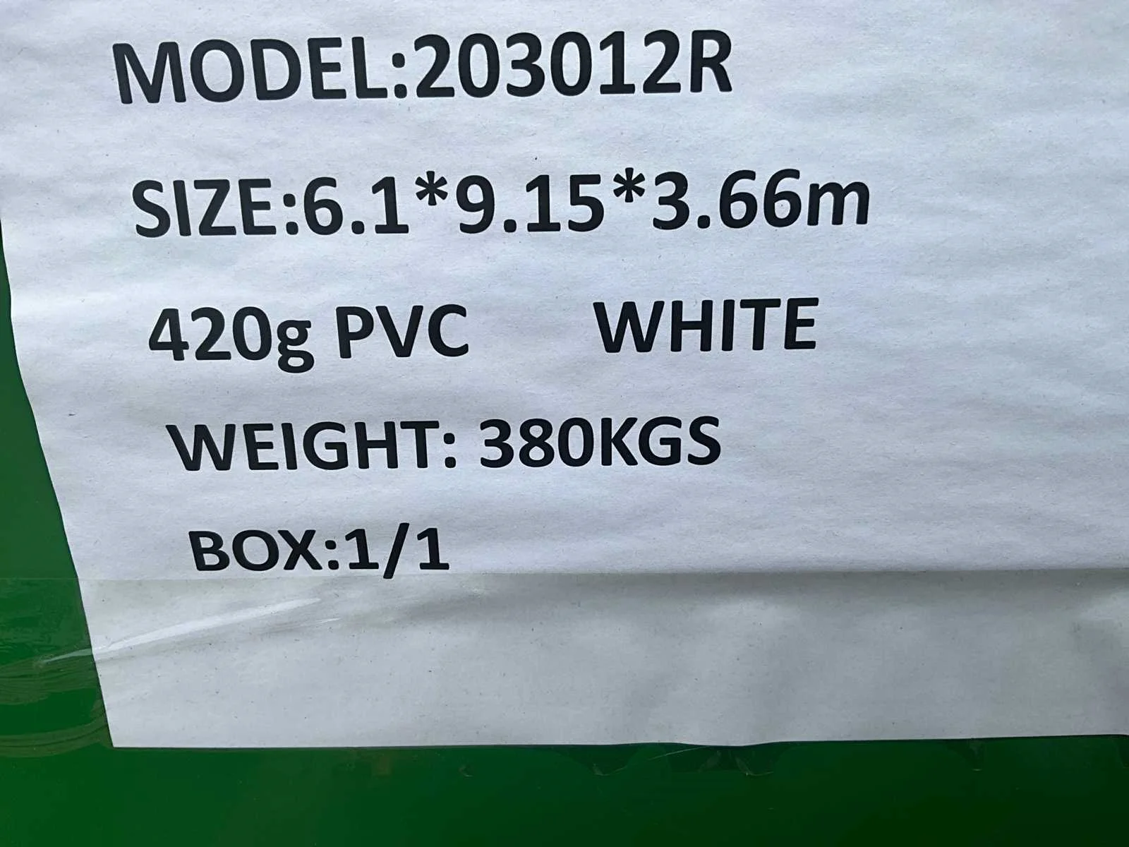 Opslagtent / garage; v.v. enkelvoudig gegalvaniseerd buizensysteem; ruimte tussen bogen 1525 mm; maatvoering boog; Φ 70x42x1,5 mm Maatvoering gording Φ 40x1,2 mm Deur met rits afmeting 4,30x3,20 meter; materiaal 420 gram PVC; kleur wit; ongebruikt; Transportafmeting metalen krat: 2200mm x 750mm x 600mm (lxbxh) Merk: Easy-Going Type: (9,10x6,10x3,65 meter) Bouwjaar: 2025 Eigen gewicht: 380kg Totale afmeting L: 9100mm Totale afmeting Breedte: 6100mm Totale afmeting Hoogte: 3650mm GS Code: 63062200
