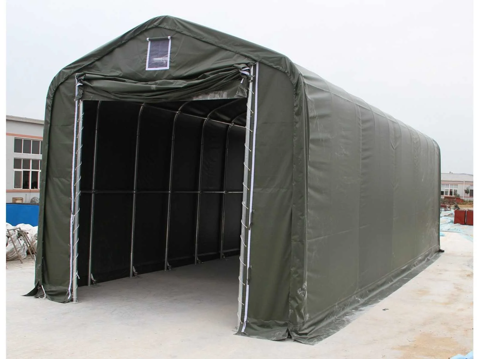 Opslagtent / garage; v.v. enkelvoudig gegalvaniseerd buizensysteem; ruimte tussen bogen 2500 mm; maatvoering boog; Φ 76x1,8 mm Maatvoering gording Φ 60x1,5 mm Deur met afmeting 3,50x3,50 meter; materiaal 420 gram PVC; kleur wit; ongebruikt in metalen kist Handleiding aanwezig Zie voor meer info downloads Transportafmeting metalen krat 2950x750x1200 mm (lxbxh) Merk: Easy-Going Type: (15,0x5,50x5,30 meter) Bouwjaar: 2025 Eigen gewicht: 1110kg Totale afmeting L: 15000mm Totale afmeting Breedte: 5500mm Totale afmeting Hoogte: 5300mm GS Code: 63062200