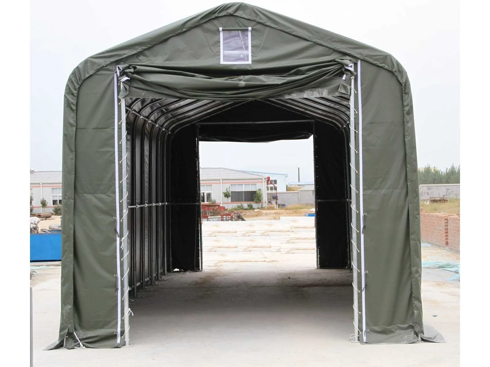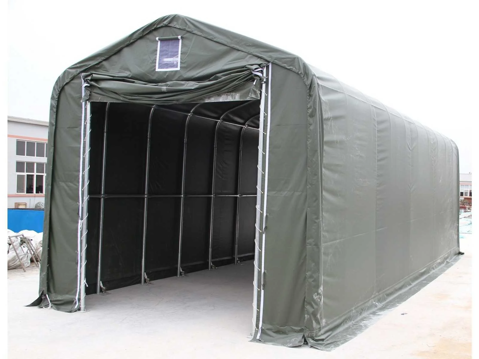 Opslagtent / garage; v.v. enkelvoudig gegalvaniseerd buizensysteem; ruimte tussen bogen 2500 mm; maatvoering boog; Φ 76x1,8 mm Maatvoering gording Φ 60x1,5 mm Deur met afmeting 3,50x3,50 meter; materiaal 420 gram PVC; kleur wit; ongebruikt in metalen kist Handleiding aanwezig Zie voor meer info downloads Transportafmeting metalen krat 2950x750x1200 mm (lxbxh) Merk: Easy-Going Type: (15,0x5,50x5,30 meter) Bouwjaar: 2025 Eigen gewicht: 1110kg Totale afmeting L: 15000mm Totale afmeting Breedte: 5500mm Totale afmeting Hoogte: 5300mm GS Code: 63062200