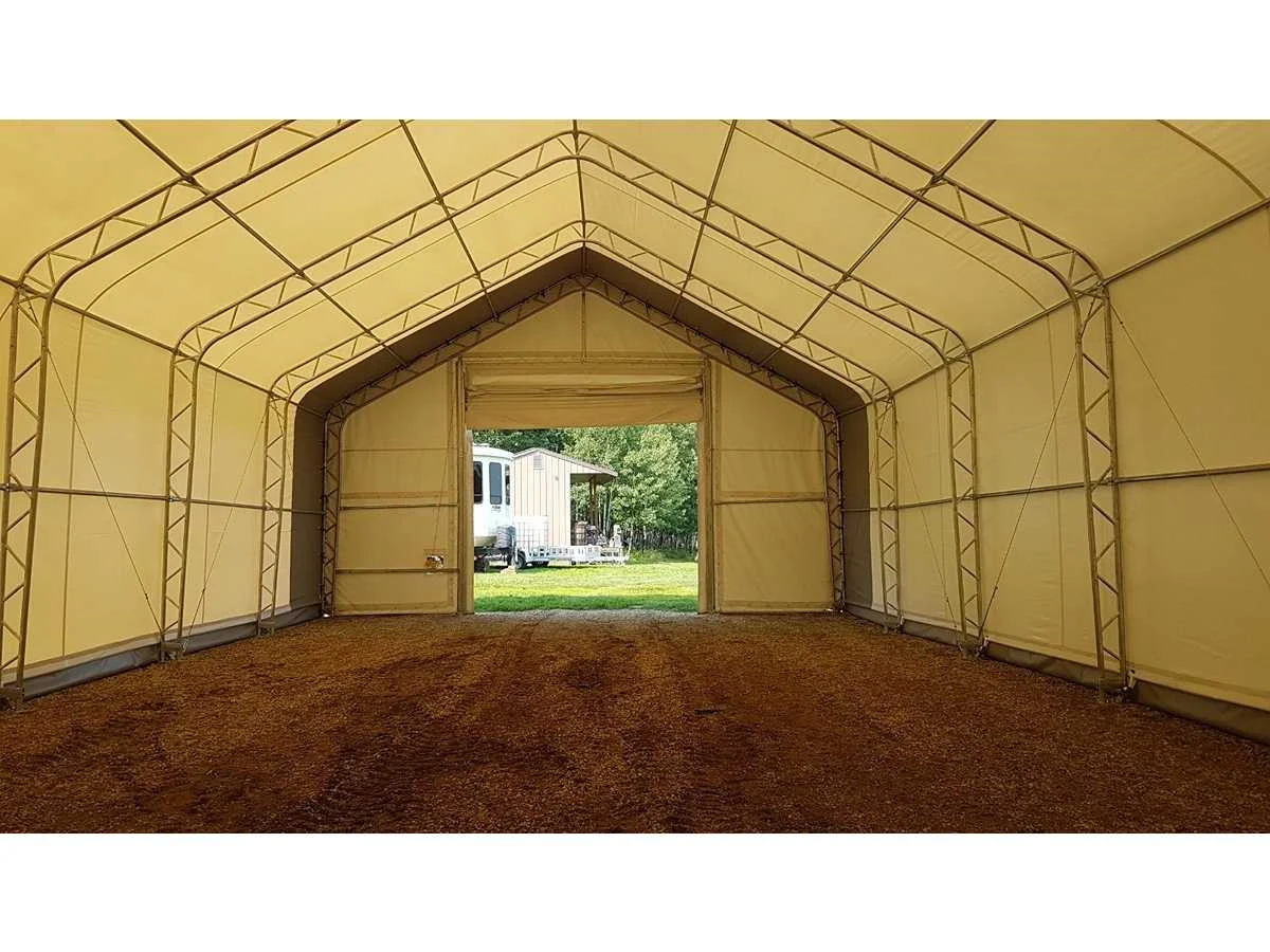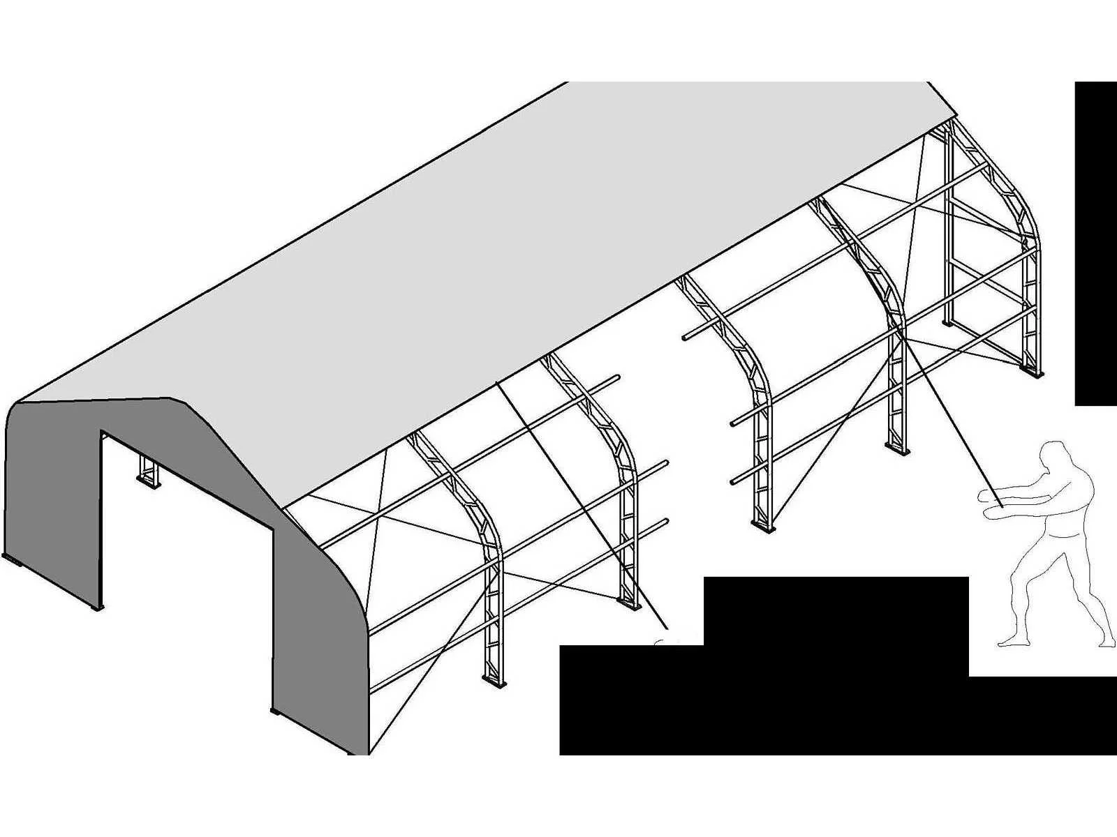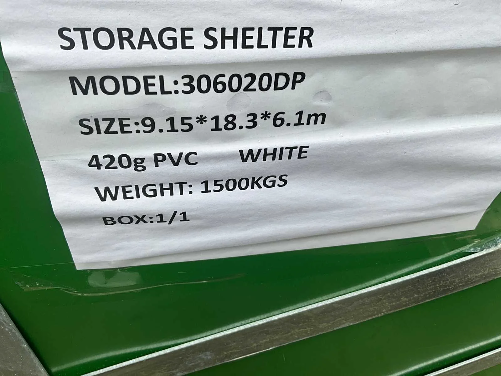 Kader: dubbelspant gegalvaniseerde buis Boog ruimte 3,05 meter Boog 48*1,5 mm Gording 48*1,5 mm Door size W14*H13ft Oproldeur met lier voor en achter Zijmuur 12ft (3,6 m) Stoffen hoes Duurzaam 420 gram PVC Stoffunctie Waterdicht, UV-bestendig, met zelfreinigende eigenschappen Spanningssysteem Pijp- en ratelbevestigingssysteem Opslagtent / garage; v.v. dubbele buizen-/trussensysteem; inclusief montage handleiding; zie voor meer info downloads; ongebruikt in metalen kist Transportafmeting metalen krat: 3150X1110x1170 mm (lxbxh) Merk: Easy-Going Type: (18,3x9,15x6,1 meter) Bouwjaar: 2025 Eigen gewicht: 1665kg Totale afmeting L: 18300mm Totale afmeting Breedte: 9150mm Totale afmeting Hoogte: 6100mm GS Code: 63062200