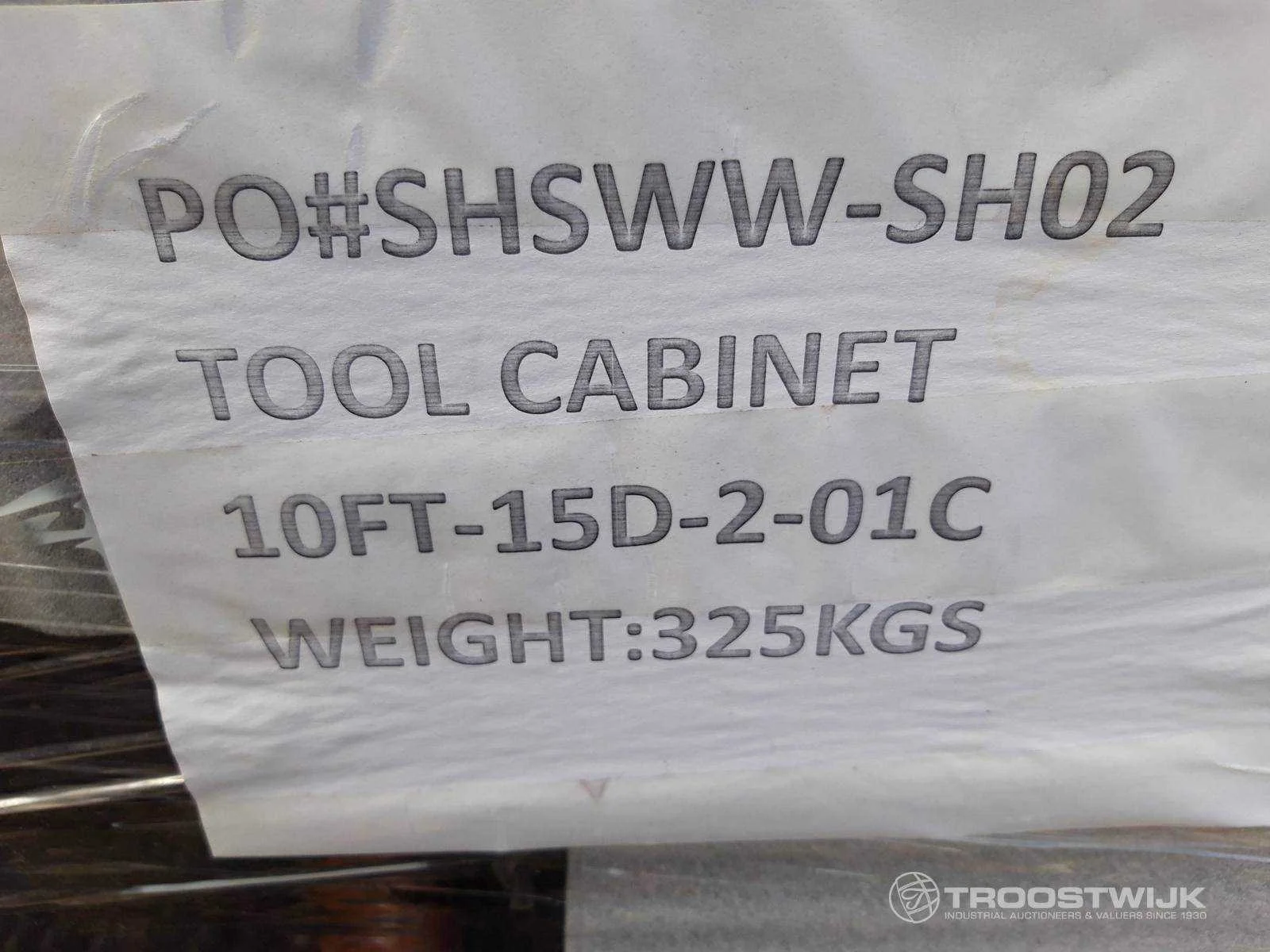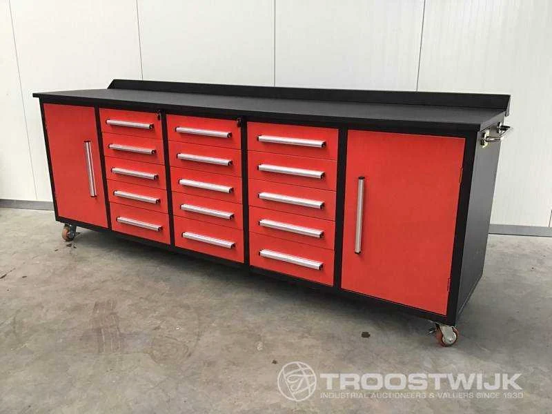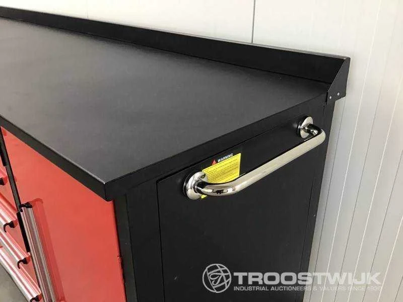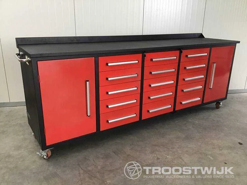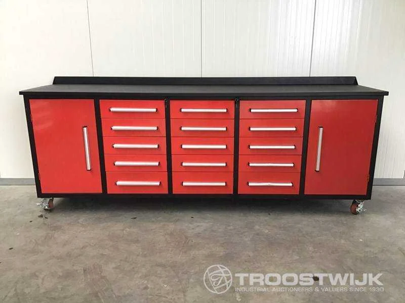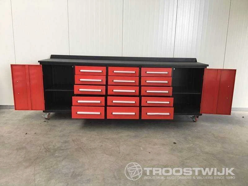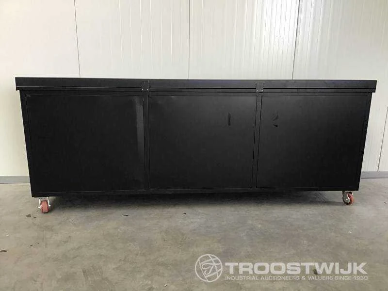 V.v. 2x sleutel; 2x ophangbeugel; 15 lades; 2x opbergvak; 3 delig schuifsysteem; antislipmat; wielen; handvat aan zijkant; totale afmeting LxBxH: 2870x720x1140; eigen gewicht: 325 kg; © ongebruikt. Merk: 2025-Easy-Going Model: 10FT-15D-2- 01C Gewicht: 325kg Lengte: 2870mm Hoogte: 1140mm Materiaal: metaal