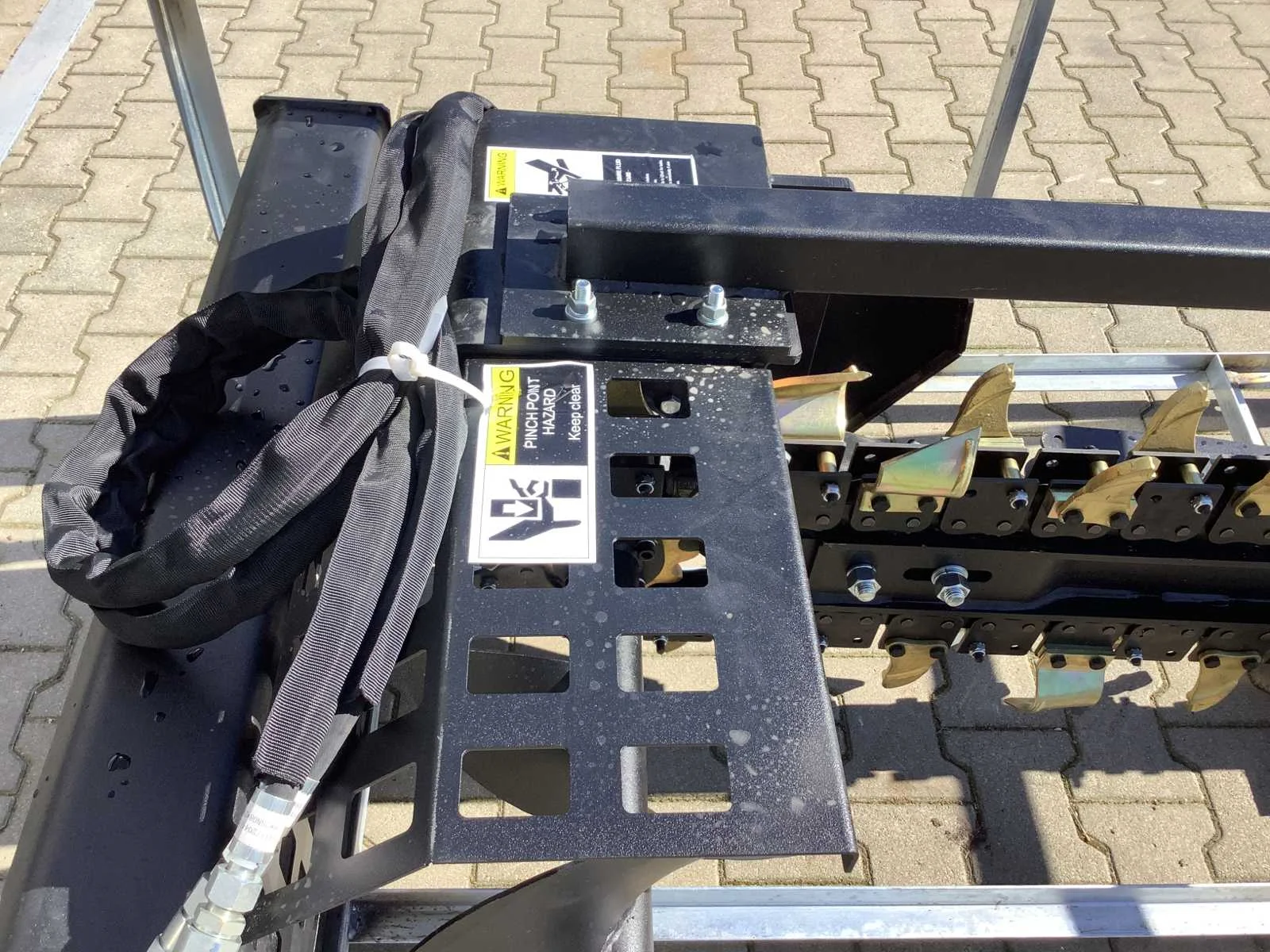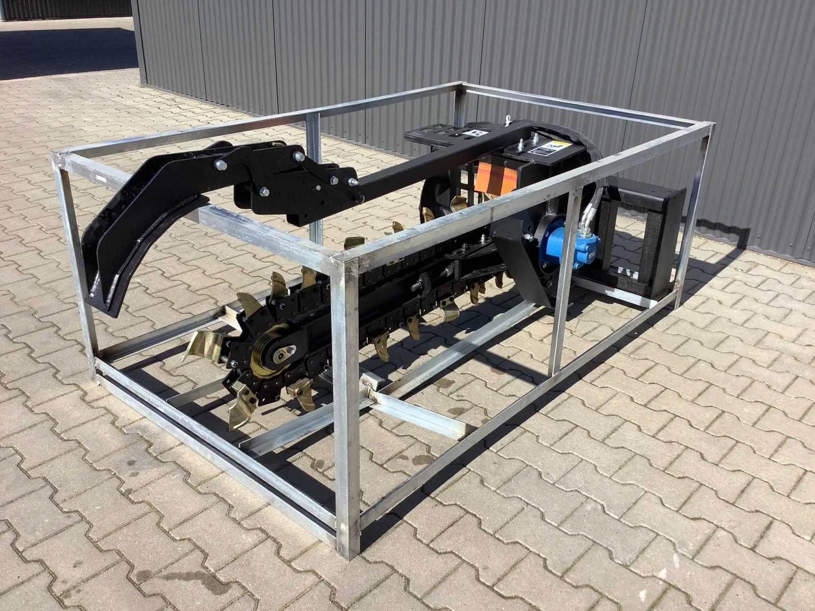 V.v. schranklader/“Bobcat” opname-/aanbouwplaat; hydromotor; hydraulisch slangenpakket; werkbreedte 860 mm; werklengte 1750 mm; kettingbreedte 180 mm; ongebruikt in stalen transportframe Merk: Easy-Going Type: Trencher Bouwjaar: 2025 Eigen gewicht: 375kg GS Code: 843280
