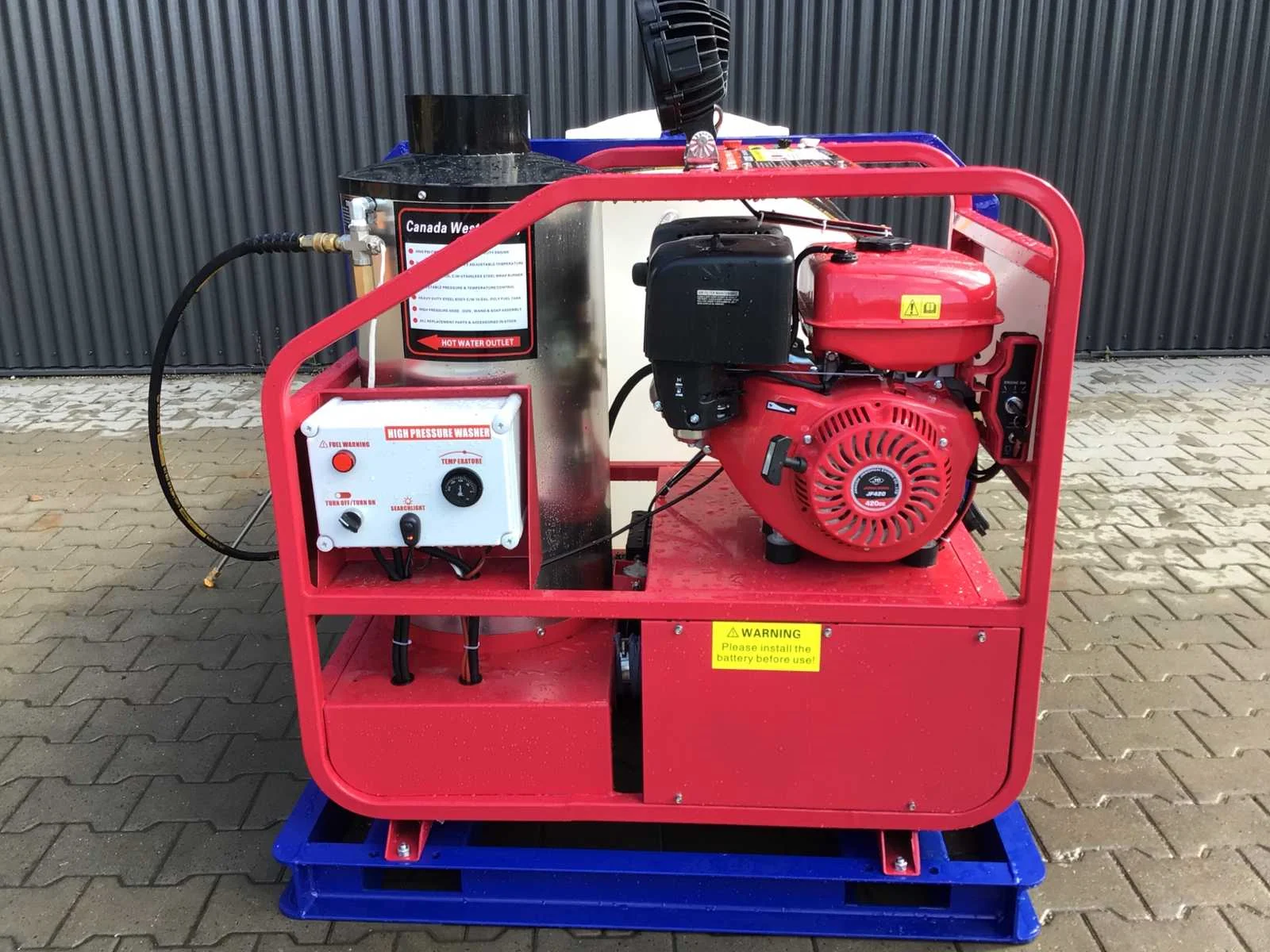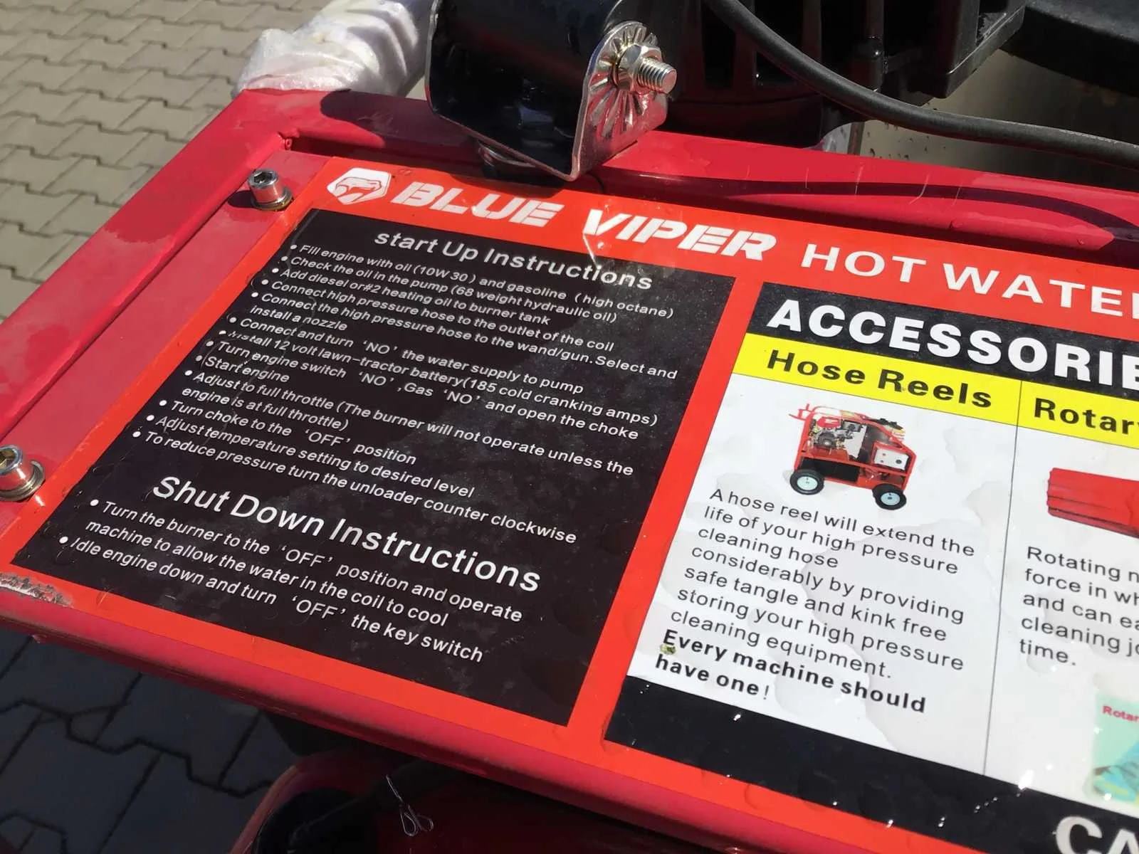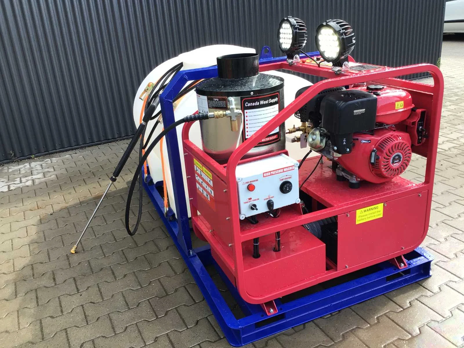 Warmwater hogedrukspuit met buffertank; 2 stuks led werklampen; watertank; hogedrukslang lengte 10 meter; hogedruklans; elektrische start; 16 pk benzinemotor 1 cilinder 4 takt; 4 extra nozzles; instelbare temperatuur tot maximaal 90 °c; rvs diesel gestookte brandersysteem; max werkdruk 4000 PSI (276 bar); inhoud watertank ca 720 liter; voorzien van lepelgaten en te verplaatsen met vorkheftruck / heftruck of shovel; venturi ventiel aansluiting voor toevoeging chemische vloeistof; handleiding aanwezig; © ongebruikt; zie voor meer info downloads Merk: Blue Viper Type: Industrial Hot Water 276 bar Bouwjaar: 2025 Maximale werkdruk: 276bar Temperatuurbereik min.: 0°c Temperatuurbereik max.: 90°c Dieselgestookt: true Mobiel: true Vermogen: 11kW Eigen gewicht: 375kg Totale afmeting L: 2220mm Totale afmeting Breedte: 1140mm Totale afmeting Hoogte: 1200mm GS Code: 842489