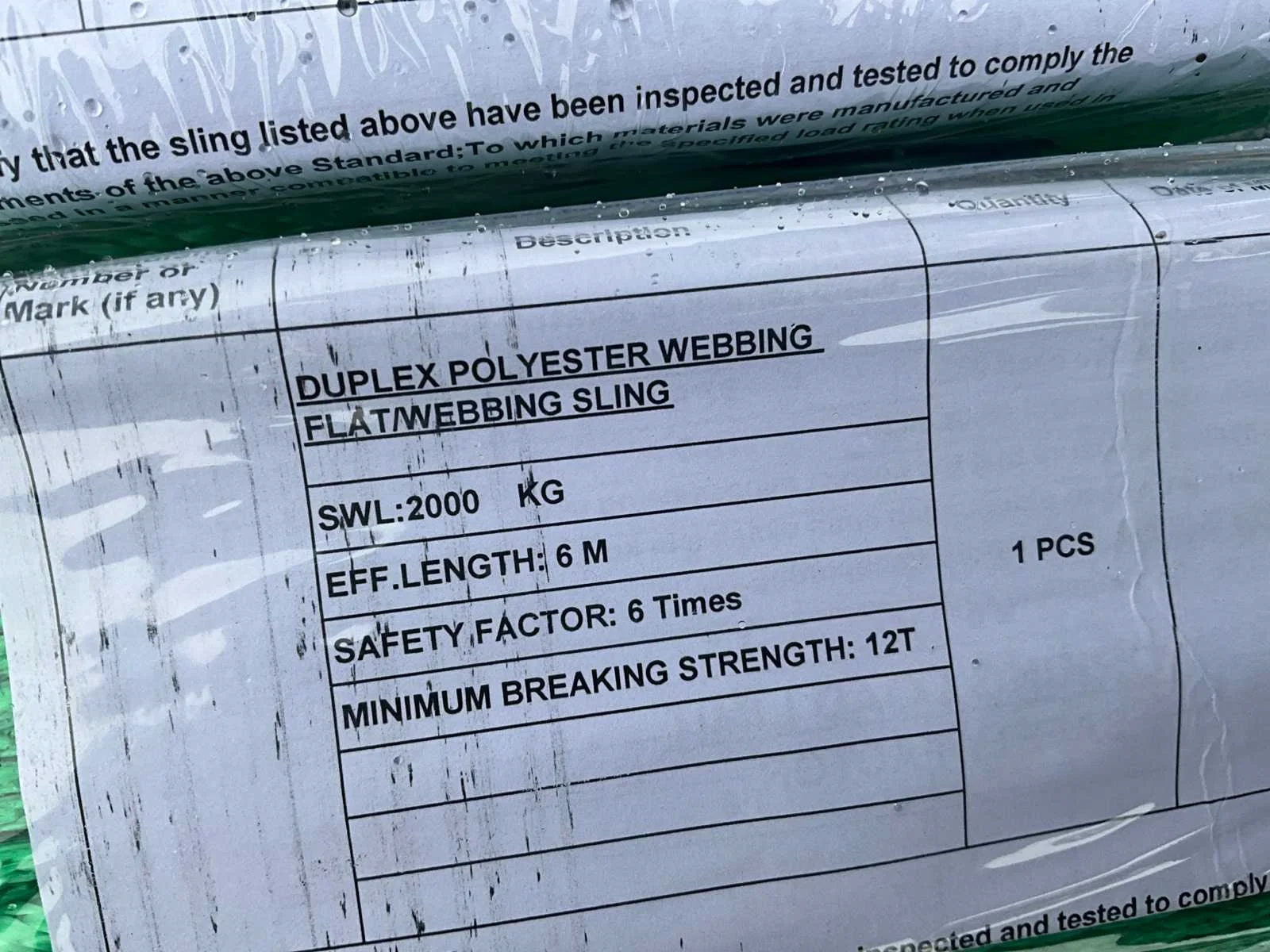 Verpakt op pallet; gewikkeld in folie; ongebruikt; materiaal duplex polyester Groen 2000 kg 2 stuks 6 meter; 2 stuks 4 meter; 2 stuks 2 meter; Geel 3000 kg 2 stuks 6 meter; 2 stuks 4 meter; 2 stuks 2 meter; Grijs 4000 kg 2 stuks 6 meter; 2 stuks 4 meter; 2 stuks 2 meter; Rood 5000 kg 2 stuks 6 meter; 2 stuks 4 meter; Merk: Easy going Type: Duplex - 2 t/m 5 ton - 2 t/m 6 meter Bouwjaar: 2025 Eigen gewicht: 49kg GS Code: 630790