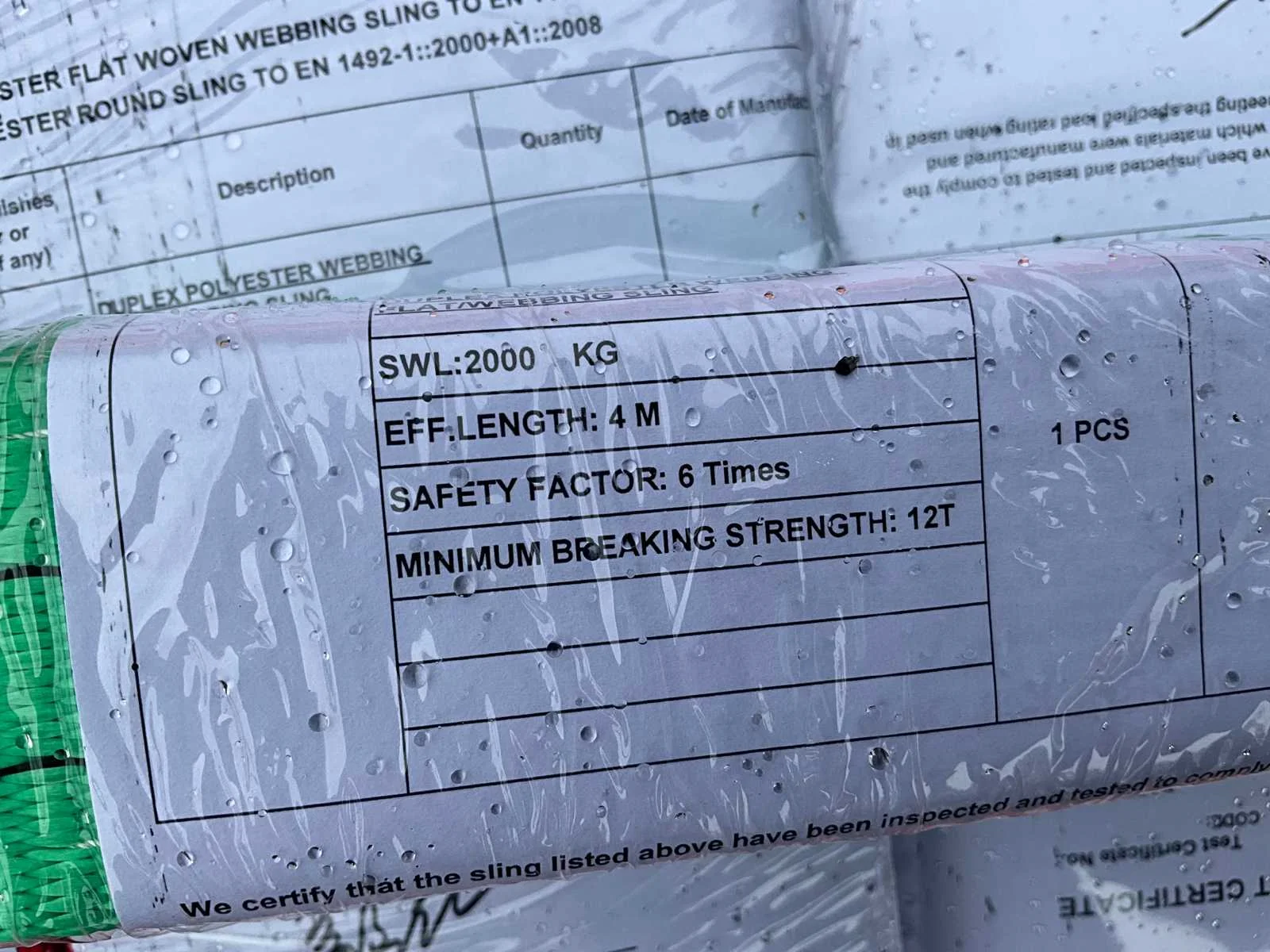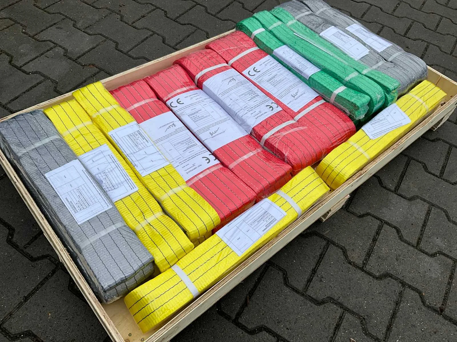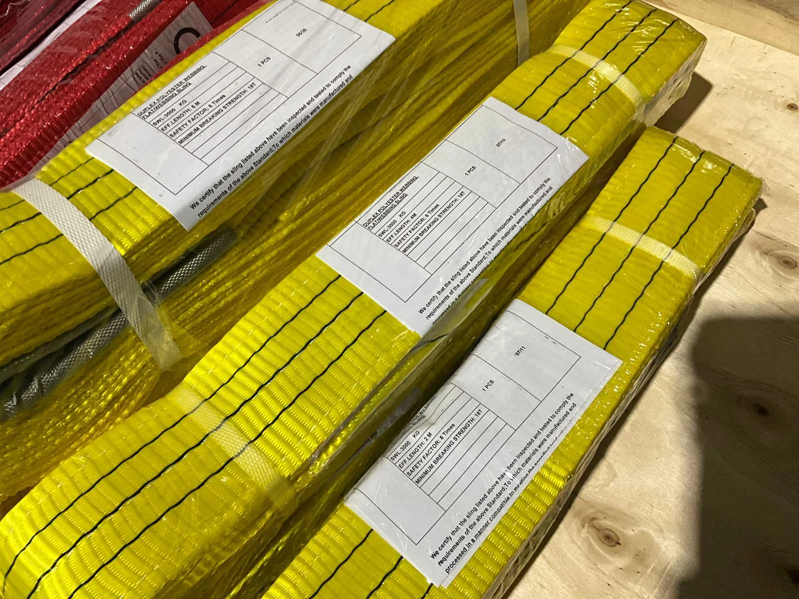Verpakt op pallet; gewikkeld in folie; ongebruikt; materiaal duplex polyester Groen 2000 kg 2 stuks 6 meter; 2 stuks 4 meter; 2 stuks 2 meter; Geel 3000 kg 2 stuks 6 meter; 2 stuks 4 meter; 2 stuks 2 meter; Grijs 4000 kg 2 stuks 6 meter; 2 stuks 4 meter; 2 stuks 2 meter; Rood 5000 kg 2 stuks 6 meter; 2 stuks 4 meter; Merk: Easy going Type: Duplex - 2 t/m 5 ton - 2 t/m 6 meter Bouwjaar: 2025 Eigen gewicht: 49kg GS Code: 630790