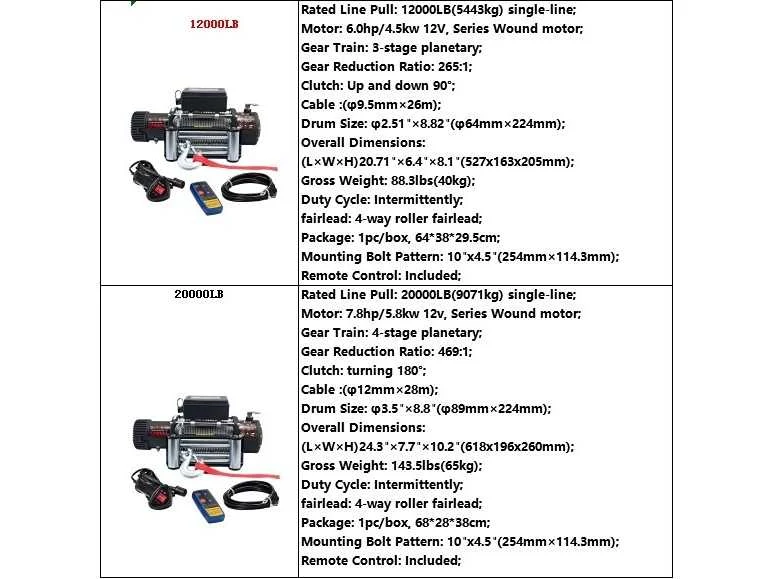 Nominale trekkracht 20000LB (9071 kg) enkele lijn Motor 7,8 pk / 5,8 KW Spanning 12 Volt DC serie gewikkelde motor tandwieltrein 4-traps planetaire overbrengingsverhouding 469:1 koppeling draaiend 180 kabel 12 mm dik 28 mtr. lang trommelmaat 89x224 mm totale afmetingen 618x196x260 mm (lxbxh) Brutogewicht 65 kg inschakelduur geleider met tussenpozen 4-weg rolgeleider bevestigingsboutpatroon 254x114,3 mm inclusief afstandsbediening handleiding aanwezig Verpakt in houten krat afmeting: 685x280x390 mm Merk: Easy-Going Model: 20000 LB / 9 ton bumperlier Product type: 12 Volt Kleur: Zwart Gewicht: 65kg Lengte: 61,8cm Breedte: 19,6cm Hoogte: 26cm Materiaal: Metaal