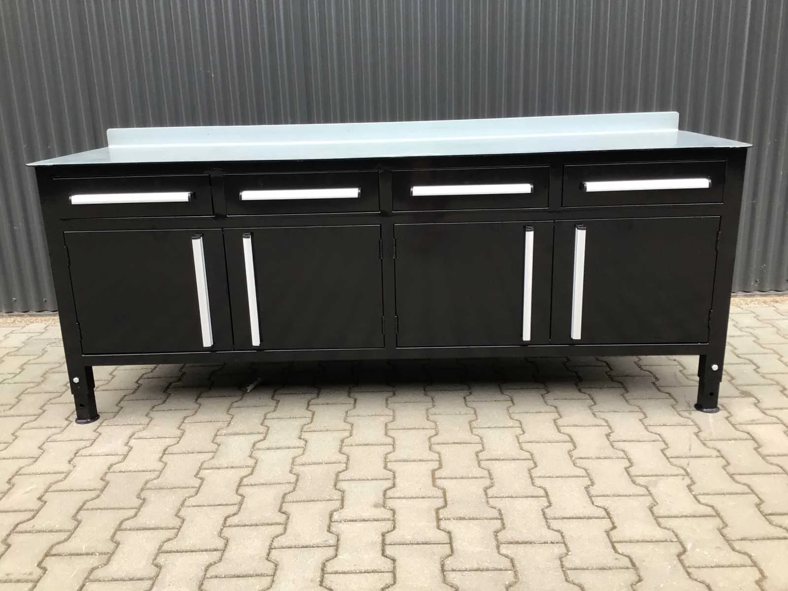 Gegalvaniseerde staal; 4 laden met 2 opbergkasten; verstelbare werkhoogte 800 tot 1100 mm; werkblad bladdikte 5 mm; pootlengte 350 mm; nieuw in beschermfolie; ongebruikt © Merk: Easy-Going Model: 7ft Product type: Lastafel Breedte: 660mm Gewicht: 198kg Lengte: 2210mm Hoogte: 1100mm Materiaal: Metaal
