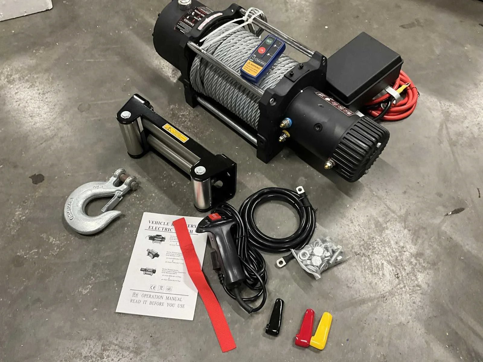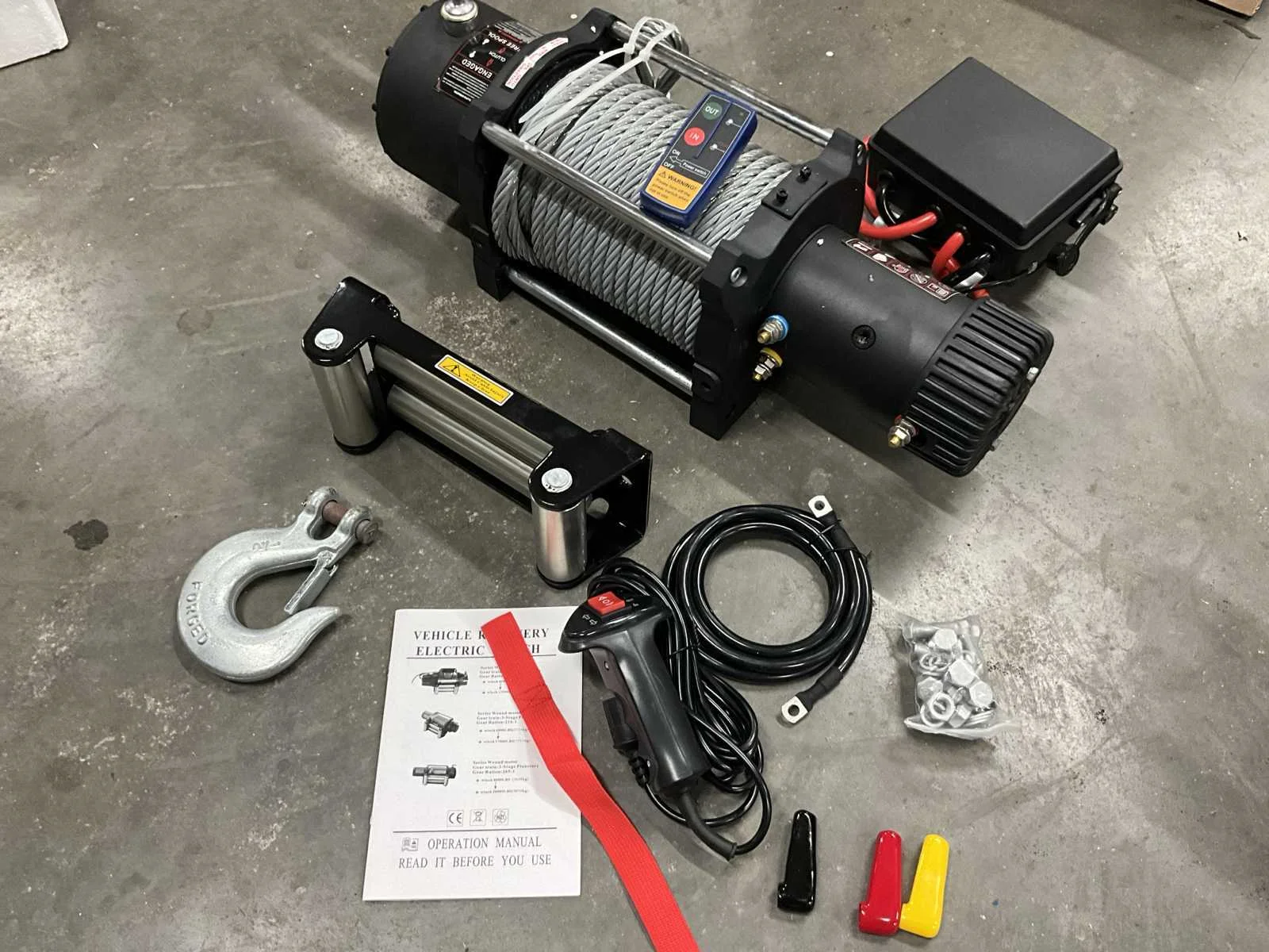 Nominale trekkracht 20000LB (9071 kg) enkele lijn Motor 7,8 pk / 5,8 KW Spanning 12 Volt DC serie gewikkelde motor tandwieltrein 4-traps planetaire overbrengingsverhouding 469:1 koppeling draaiend 180 kabel 12 mm dik 28 mtr. lang trommelmaat 89x224 mm totale afmetingen 618x196x260 mm (lxbxh) Brutogewicht 65 kg inschakelduur geleider met tussenpozen 4-weg rolgeleider bevestigingsboutpatroon 254x114,3 mm inclusief afstandsbediening handleiding aanwezig Verpakt in houten krat afmeting: 685x280x390 mm Merk: Easy-Going Model: 20000 LB / 9 ton bumperlier Product type: 12 Volt Kleur: Zwart Gewicht: 65kg Lengte: 61,8cm Breedte: 19,6cm Hoogte: 26cm Materiaal: Metaal