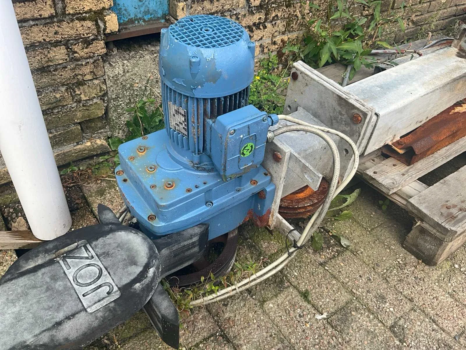 Console met elektromotor 380 volt 0,55 / 0,75 KW; met toebehoren; nieuwe kabel op haspel ca. 400 mtr. Merk: Joz mestschuif installatie Type: 03.073.011 Serienummer: 0785
