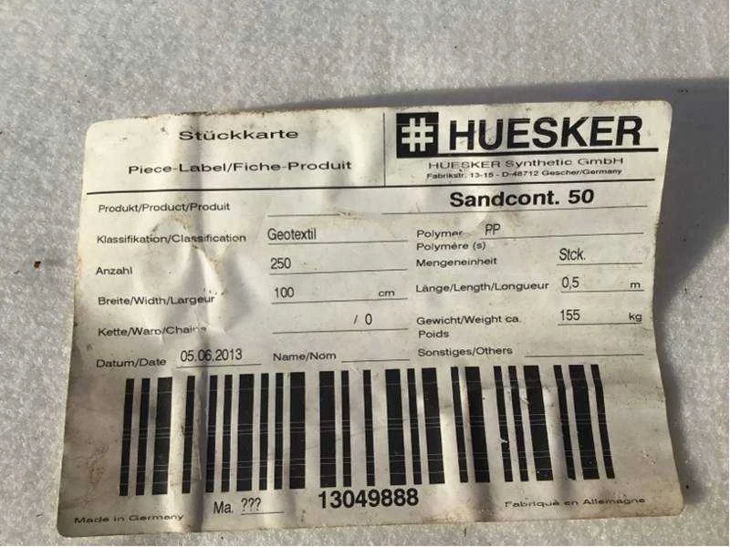 Omschrijving: V.v. 2 lussen; geotextiel; blanco; ongebruikt; afmeting L: 1000 mm; afmeting B: 500 mm Merk: Huesker Type: Sandcont. 50 Afmeting b: 500mm Afmeting l: 1000mm