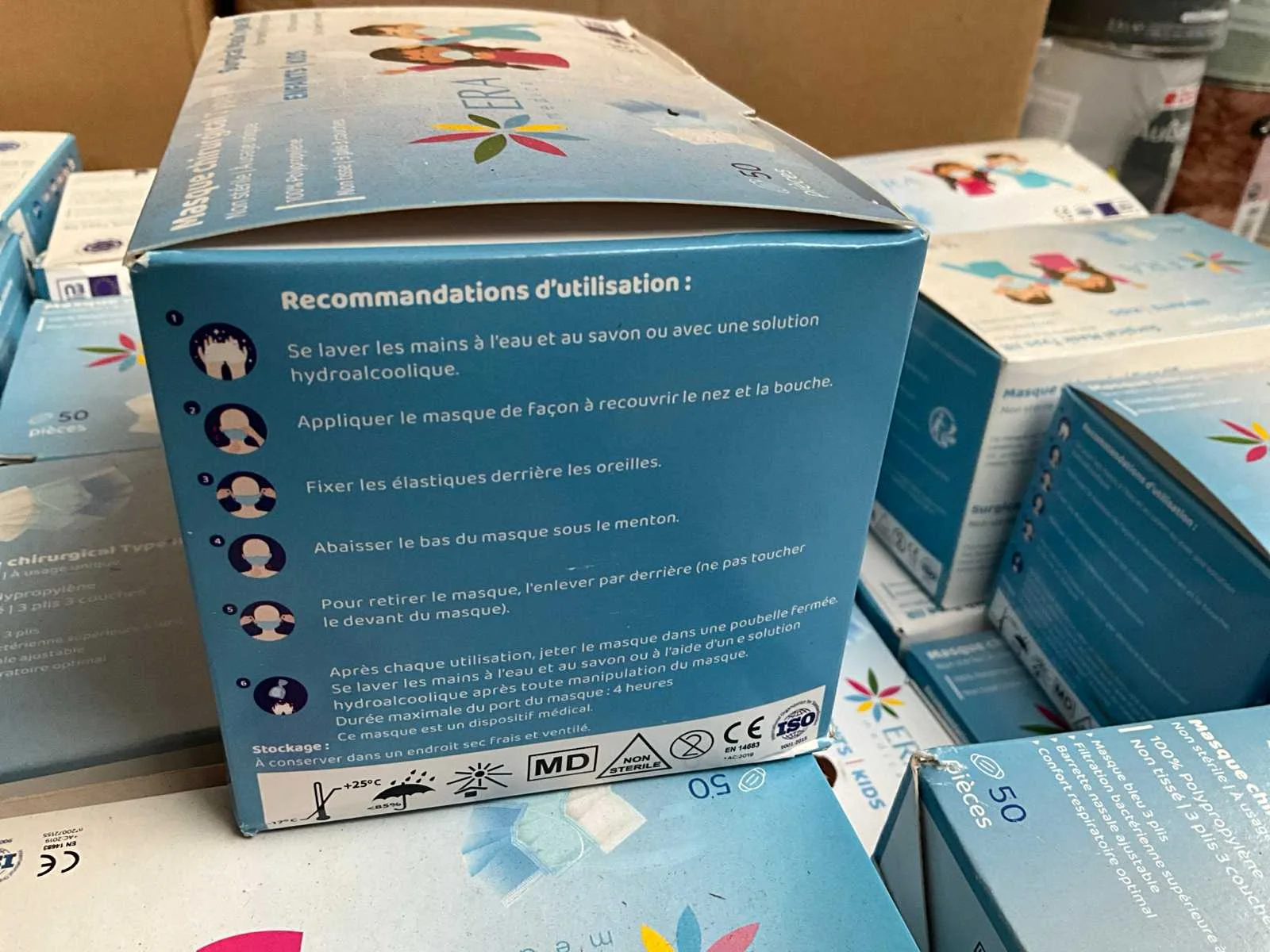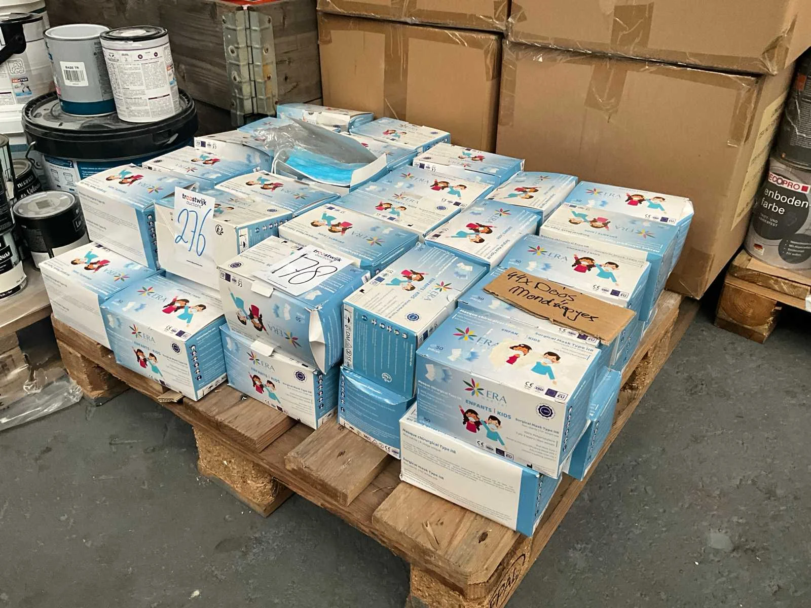 Betreft ongebruikte partij, pallet niet inbegrepen, aantal is circa 13 dozen met onbekend aantal mondkapjes Merk: Partij
