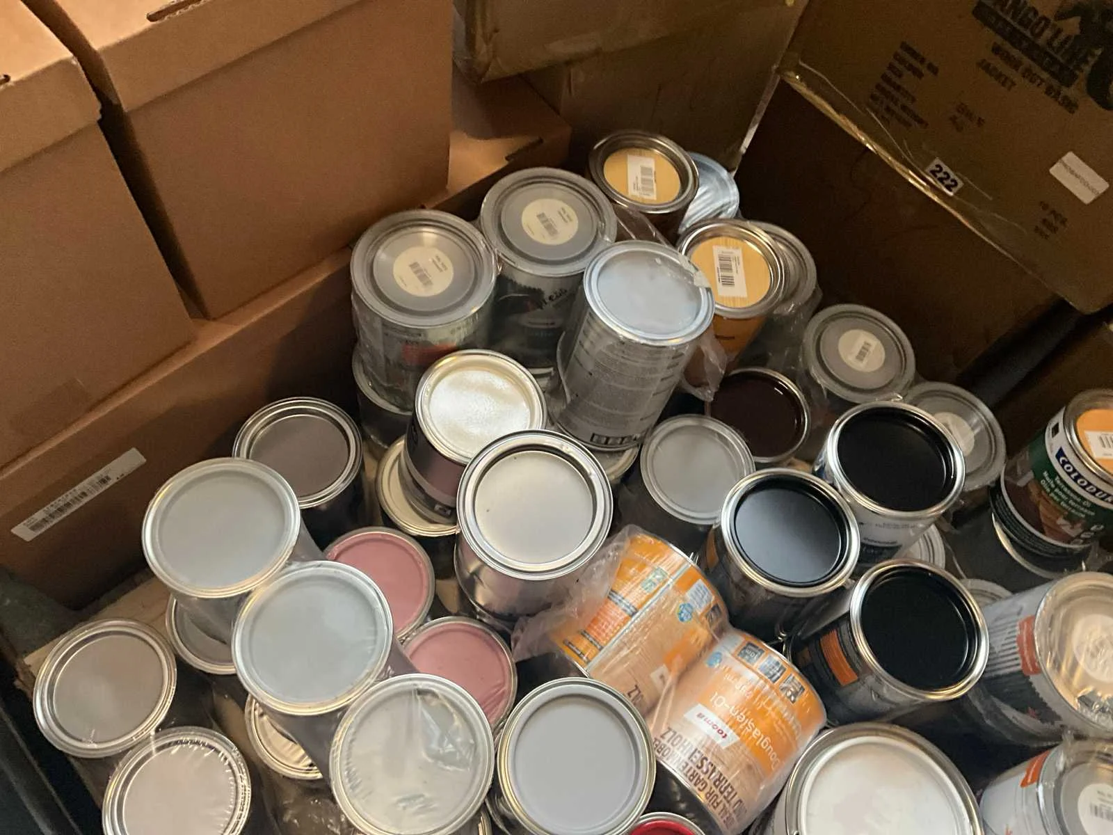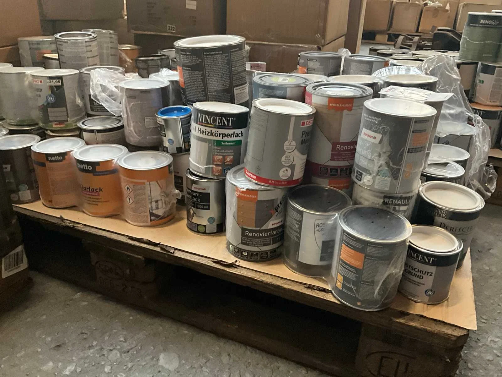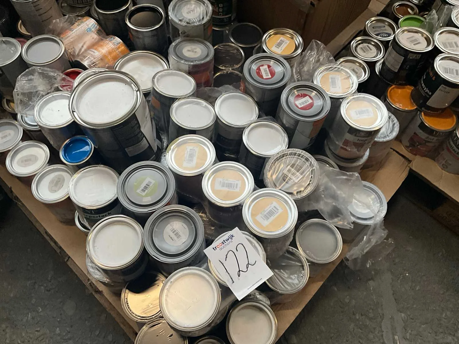 1 pallet , diverse kleuren verf; Pallet niet bij kavel inbegrepen; Aantal niet gecontroleerd ;