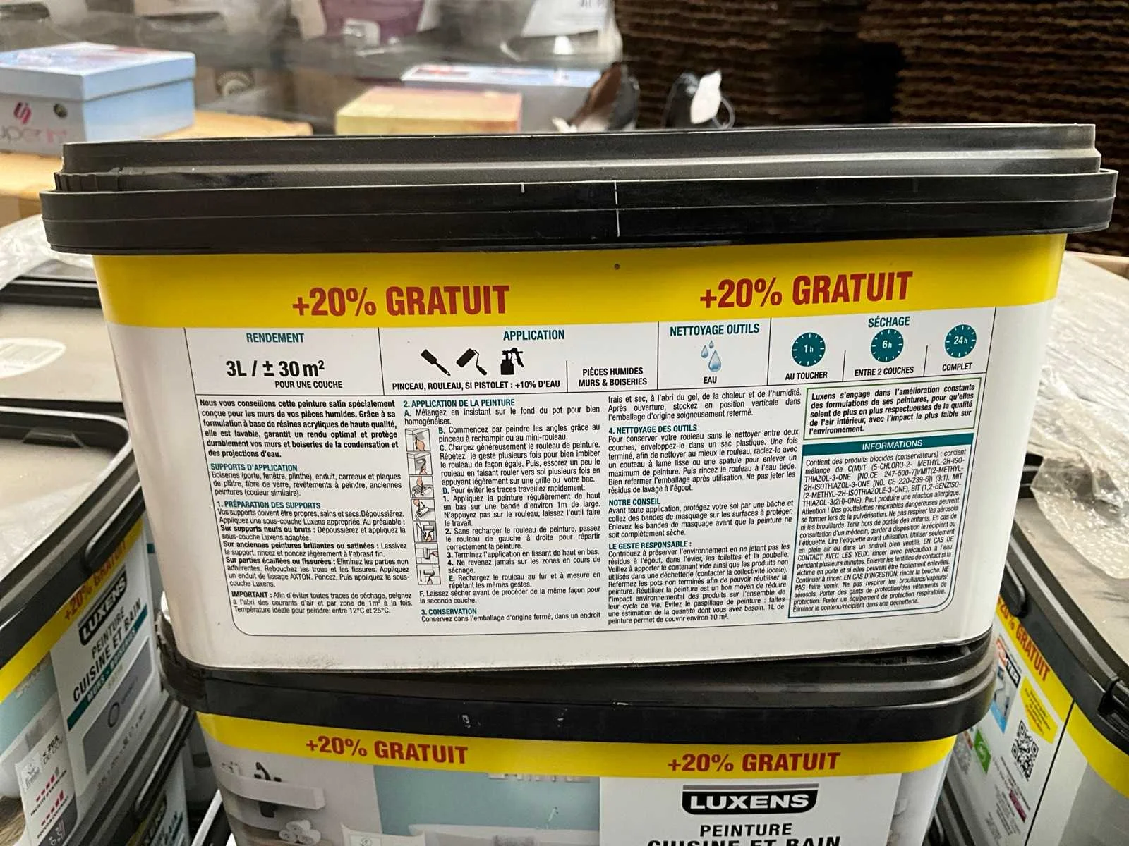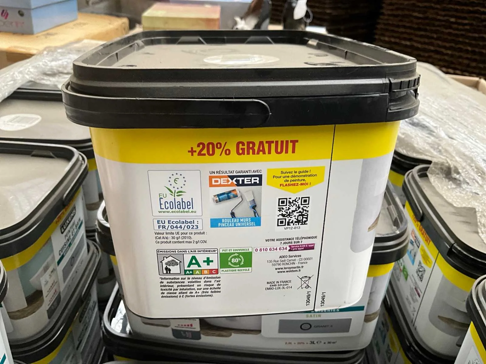 Ongeopend met seal; nieuw; circa 100 emmers a 3 liter; bekijk foto’s voor meer informatie; niet gecontroleerd op maten, aantallen & kleur; Merk: Luxens Type: Granit 3