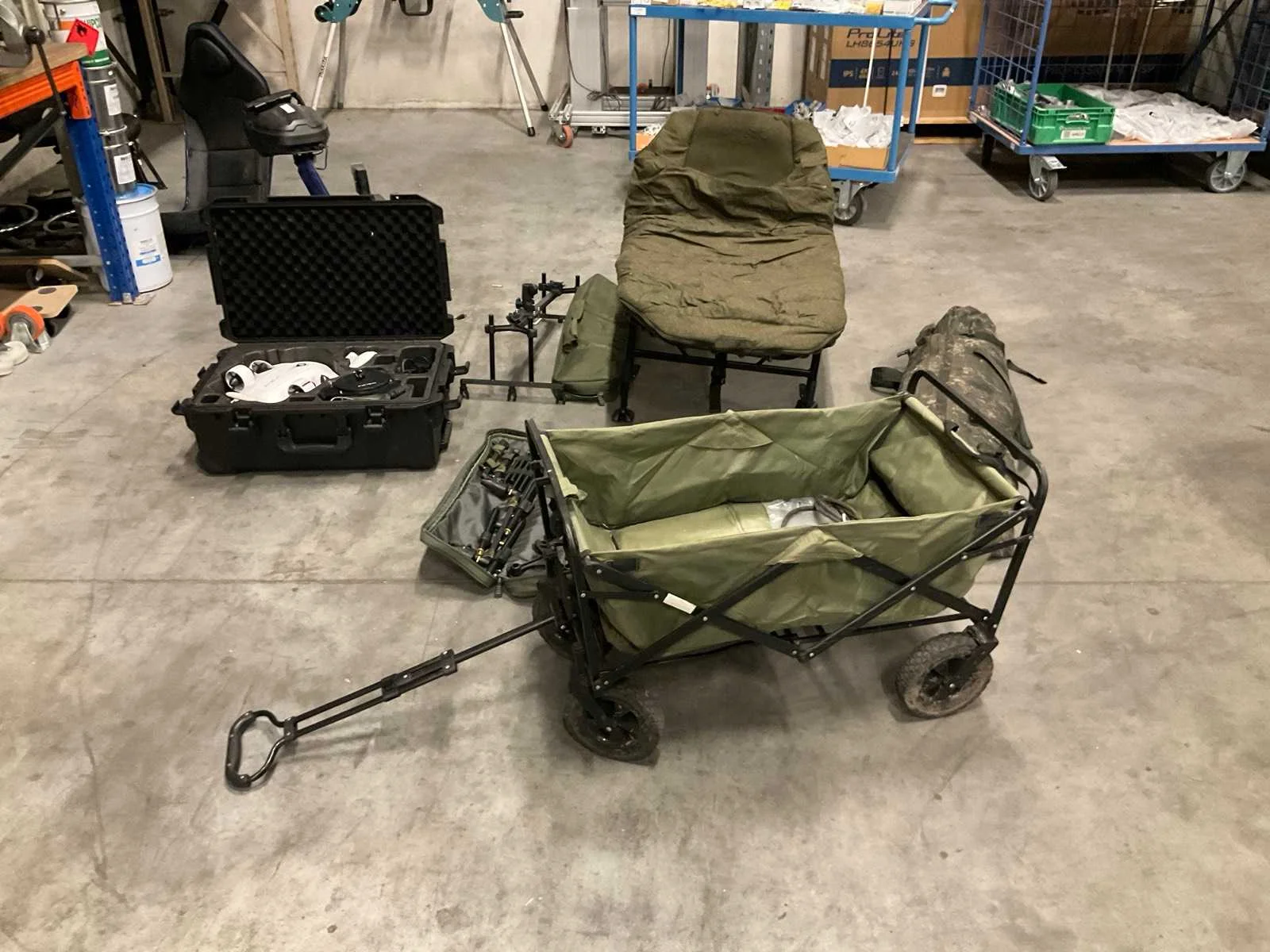 Bestaande uit onderwaterdrone, tent, stretcher, bolderkar, hengelsteunen