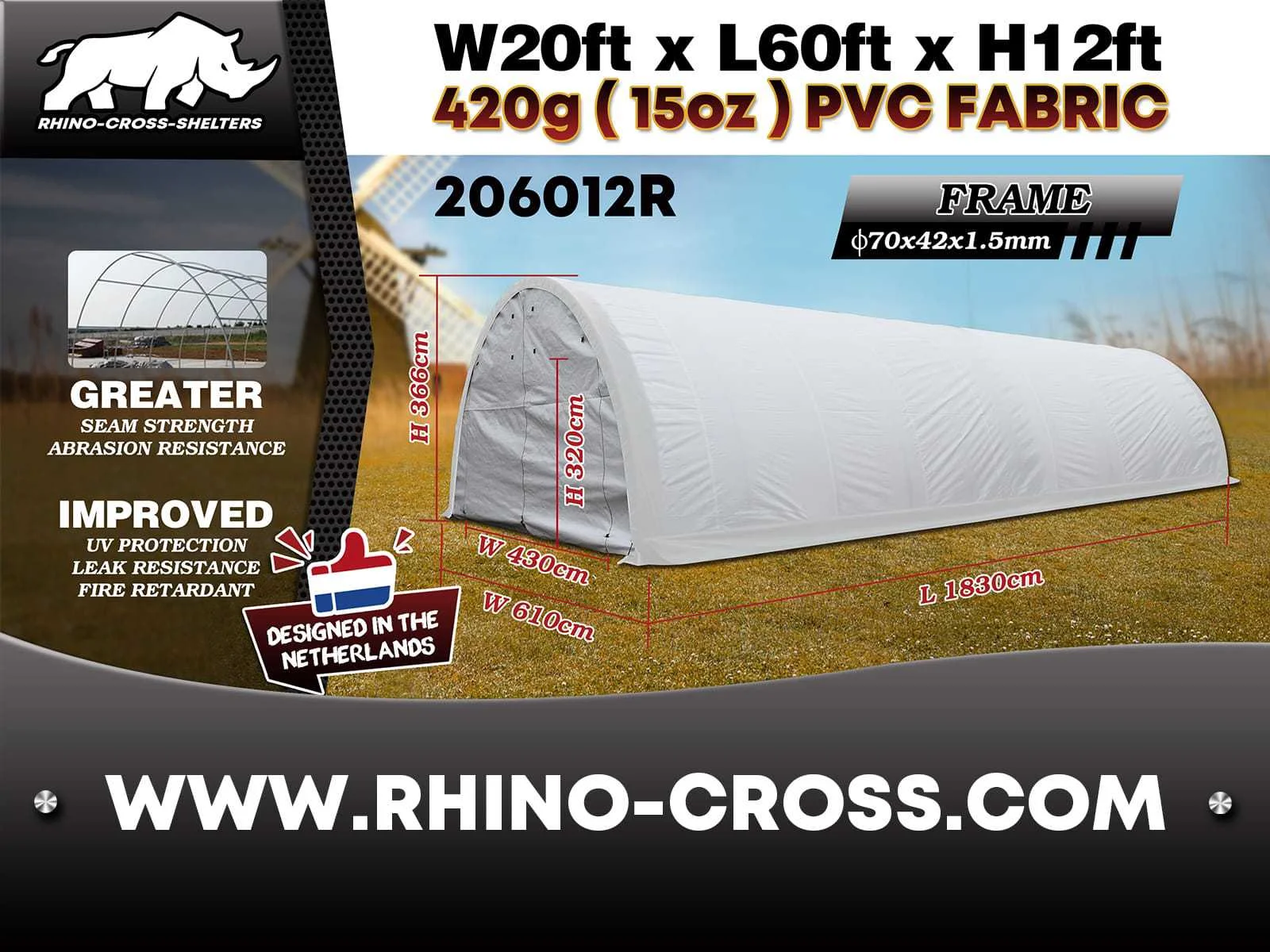 Voorzien van opslagtent / opslag shelter; singel trussen-/buizensysteem; gegalvaniseerd; beide uiteinden een deur; materiaal 420 gram PVC cover; kleur wit; inclusief montage handleiding; ongebruikt in metalen kist (transport afmetingen 216x75x82 cm) Merk: Rhino-Cross-Shelter Type: 206012R - 18,3x6,1x3,66 m Bouwjaar: 2025 Eigen gewicht: 730kg Totale afmeting L: 18300mm Totale afmeting Breedte: 6100mm Totale afmeting Hoogte: 3660mm