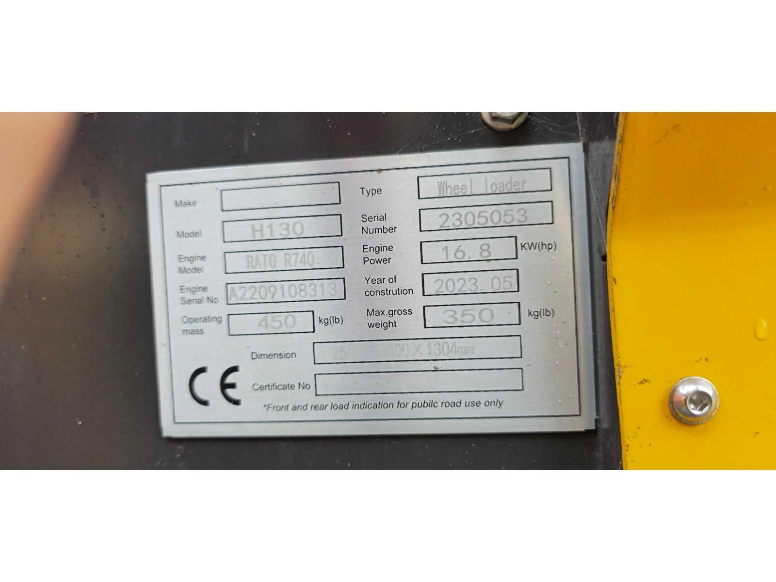 Voorzien van; vol hydraulisch lader; stuur is verbogen Merk: Mini wheel loader Type: H130 Bouwjaar: 2025 Merk motor: RATO R740 Brandstof: Benzine Eigen gewicht: 350kg Totale afmeting L: 2500mm Totale afmeting Breedte: 1000mm Totale afmeting Hoogte: 1304mm