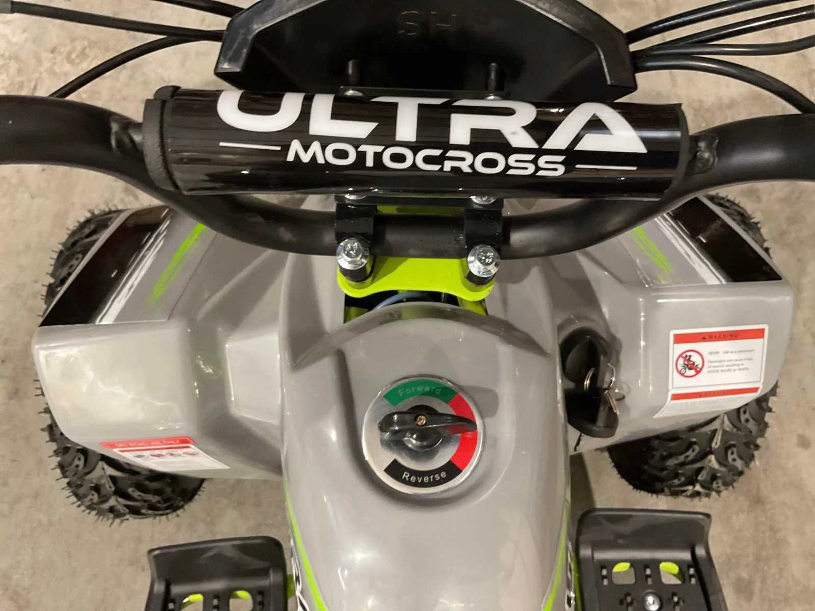 Voorzien van Krachtige 1000W motor; 36V accu; Snelheidsregelaar met 2 standen (10, 25 km/h); Achteruitschakelaar; Verlichting; Schijfremmen voor & achter; Ongebruikt Merk: Ultra Motocross Model: MA05E GR Product type: 1000W Kleur: Grijs/Groen