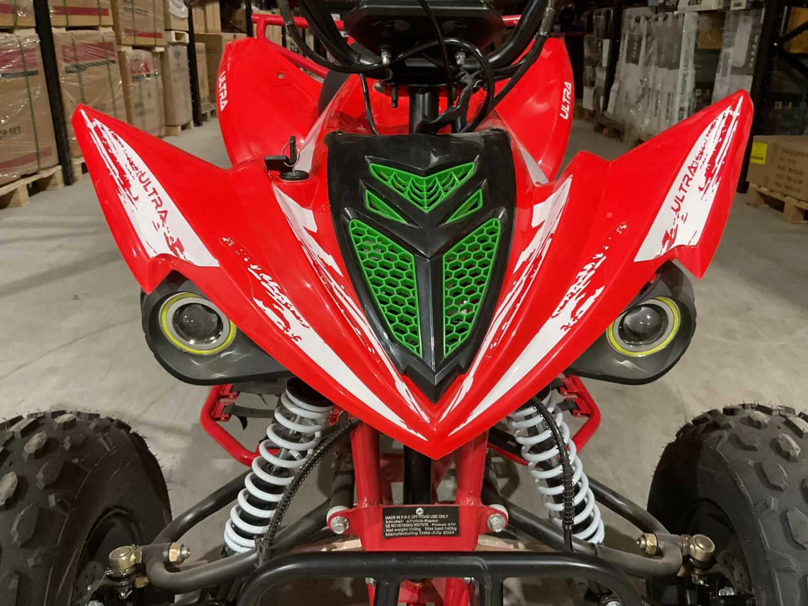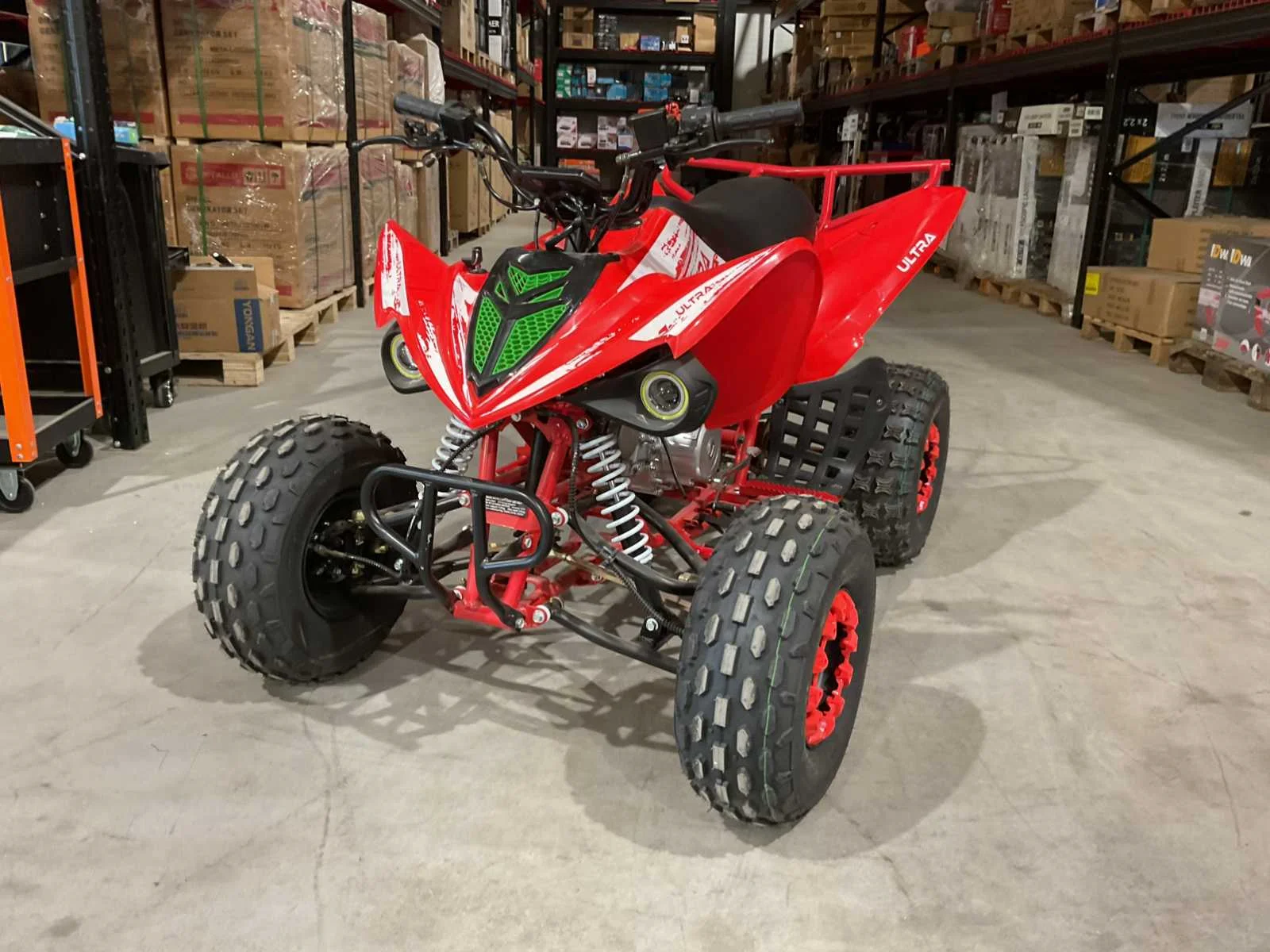 Voorzien van elektrische start; 4 takt; 125 cc; hydraulische schijfremmen; bandenmaat 8” inch; LCD scherm; 2 sleutels; ongebruikt in krat (transport afmetingen 145x90x65 cm 120kg) Merk: Ultra Motocross Model: Miniraptor125 Product type: ATX 125 Raptor RD Gewicht: 105kg Transmissie: Semi automaat Bouwjaar: 2025 Vermogen (pk): 9hp Cilinderinhoud: 125cc Kleur: Rood