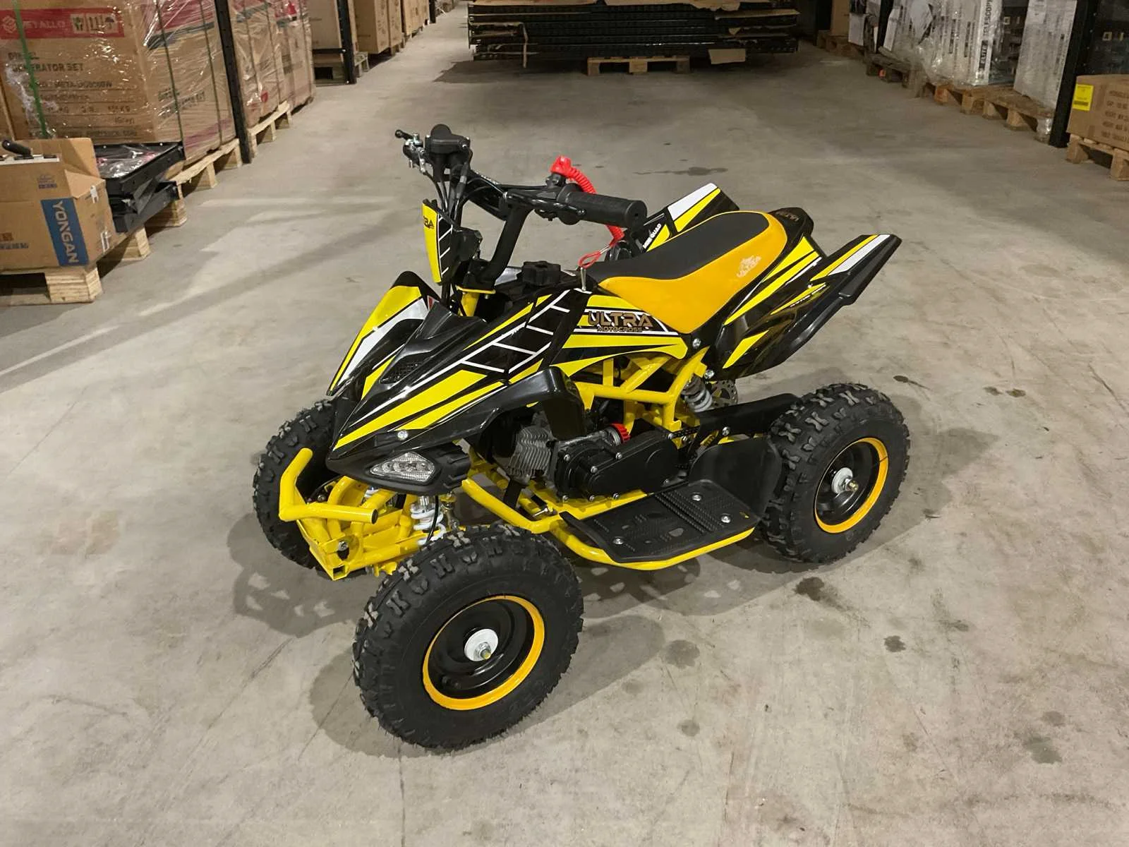 Voorzien van 49cc benzine motor; 2 takt; trek start; 3 verschillende snelheden; kill-switch; bandenmaat 6” inch; 2 sleutels; ongebruikt in doos (transport afmetingen 100x55x45 cm 36kg) Merk: Ultra Motocross Model: MA03 Product type: ATX 49 GE Gewicht: 34kg Aantal sleutels: 2 Transmissie: Automaat Bouwjaar: 2025 Cilinderinhoud: 49cc Brandstof: Benzine 2 Takt Kleur: Geel