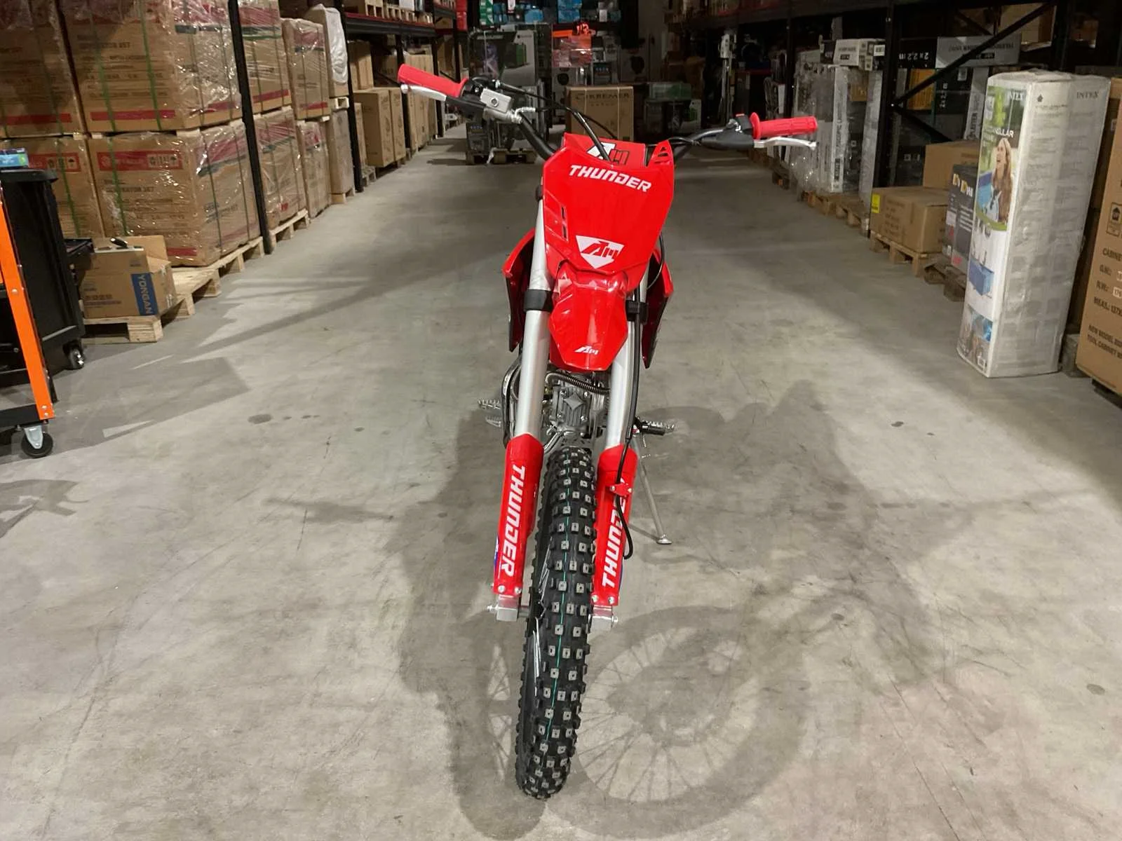 Voorzien van 150 cc motor; 4 takt; kick start; olie gekoeld; bandenmaat voor 19” inch achter 16” inch; hydraulische vering voor en achter; schijfremmen; ongebruikt in doos (transport afmetingen 150x40x75 cm) Merk: Ultra Motocross Type: Thunder 150 BL Brandstof: Benzine 4 Takt Cilinderinhoud: 150cc Gewicht: 91kg Transmissie: Schakel Aantal sleutels: 2