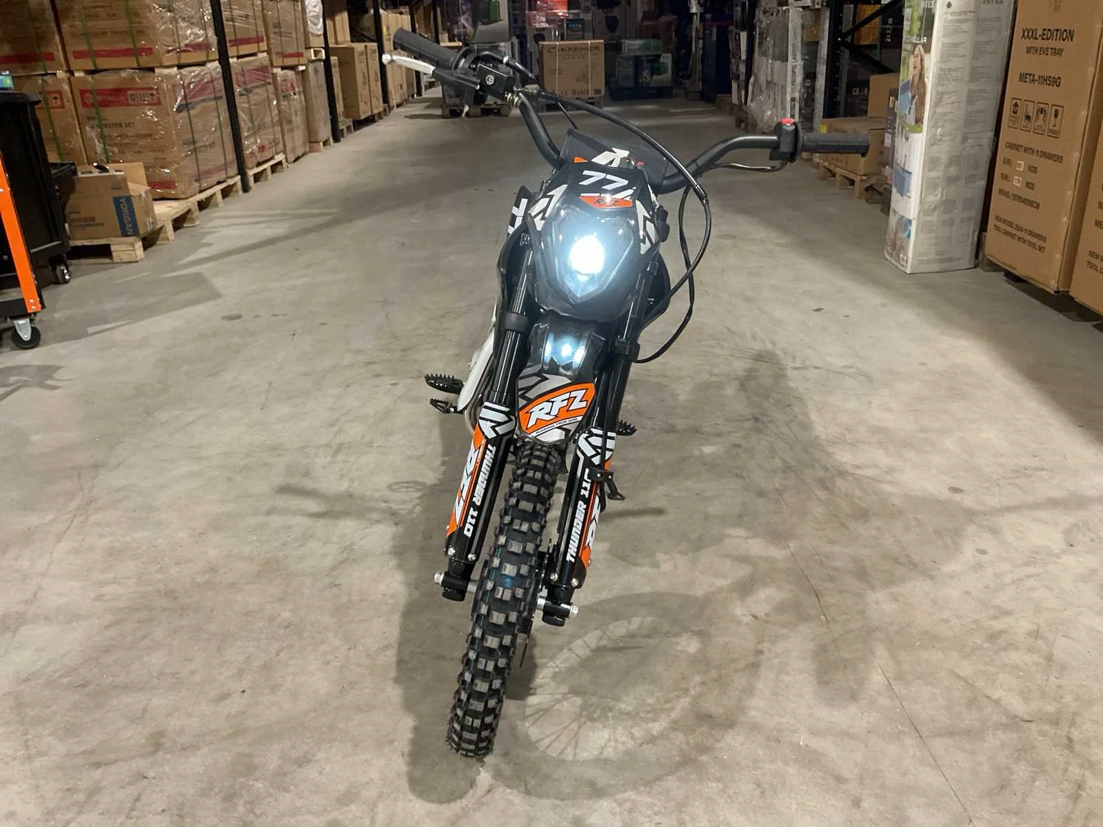 Voorzien van 110 cc motor; 4 takt; kick start; bandenmaat voor 14” inch achter 12” inch; hydraulische vering voor en achter; schijfremmen; verlichting; ongebruikt in doos (transport afmetingen 130x40x70 cm) Merk: Ultra Motocross Type: Thunder 110 OR Brandstof: Benzine 4 Takt Cilinderinhoud: 110cc Gewicht: 83kg Kleur: Oranje Transmissie: Automaat Aantal sleutels: 2