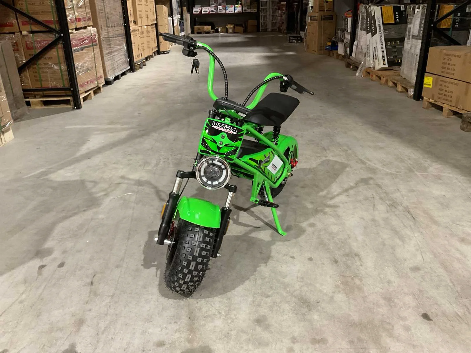 Voorzien van 48V 1000W motor; Led verlichting voor en achter; Led dashboard met kilometerteller; 3 snelheid standen; Topsnelheid circa 45kmh; Actieradius +-20km; Zadelhoogte: 62cm; Electromotor direct op het achterwiel!; Afmeting gemonteerd: 130x70x90cm (LxBxH); Maximaal toelaatbaar gewicht: 100KG; Ongebruikt in doos (Verzend afmetingen: 1200x320x640, gewicht 41kg) Merk: Ultra Motocross Model: Viper MUL TX 50 Type: GR Brandstof: Elektrisch Kleur: Groen Bouwjaar: 2025