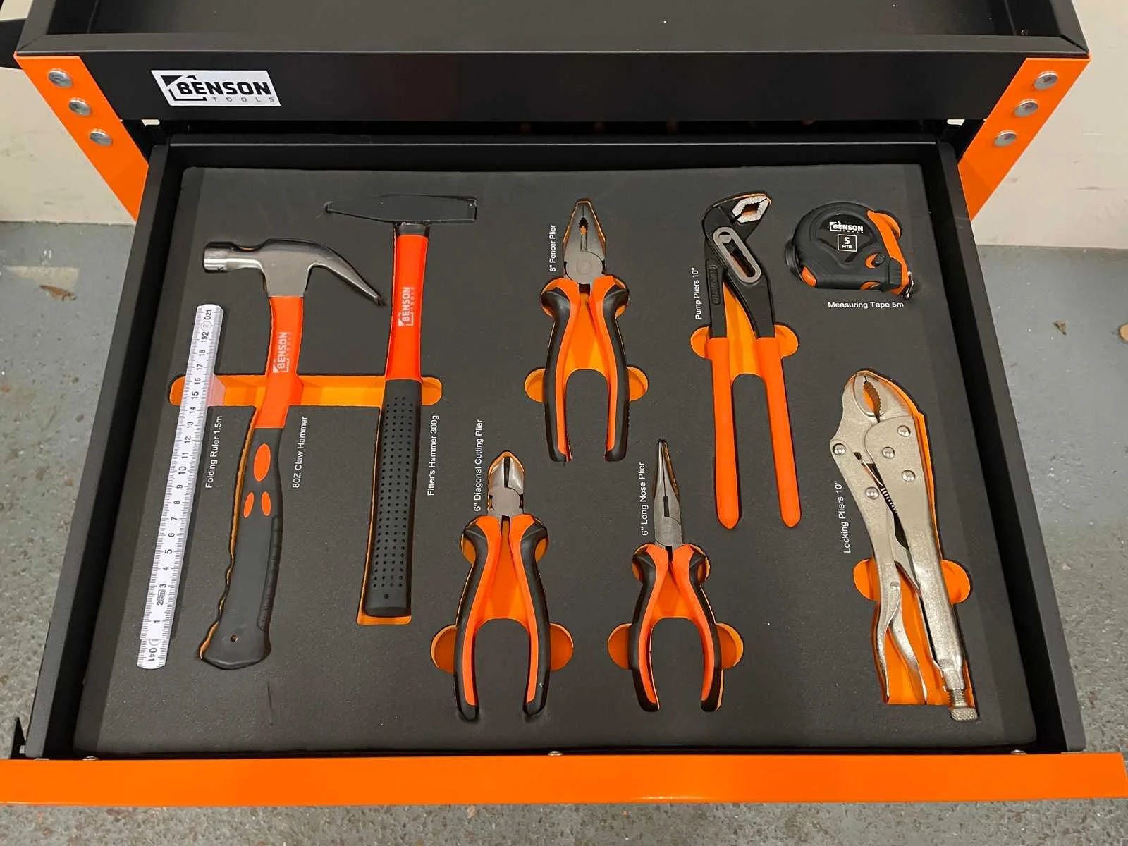 Voorzien van 73 delig; 3 laden; 2 zwenkwielen; ongebruikt in doos Merk: Benson Bouwjaar: 2024 Aantal laden: 3 Met inhoud: true Totale afmeting L: 665mm Totale afmeting Breedte: 465mm Totale afmeting Hoogte: 885mm
