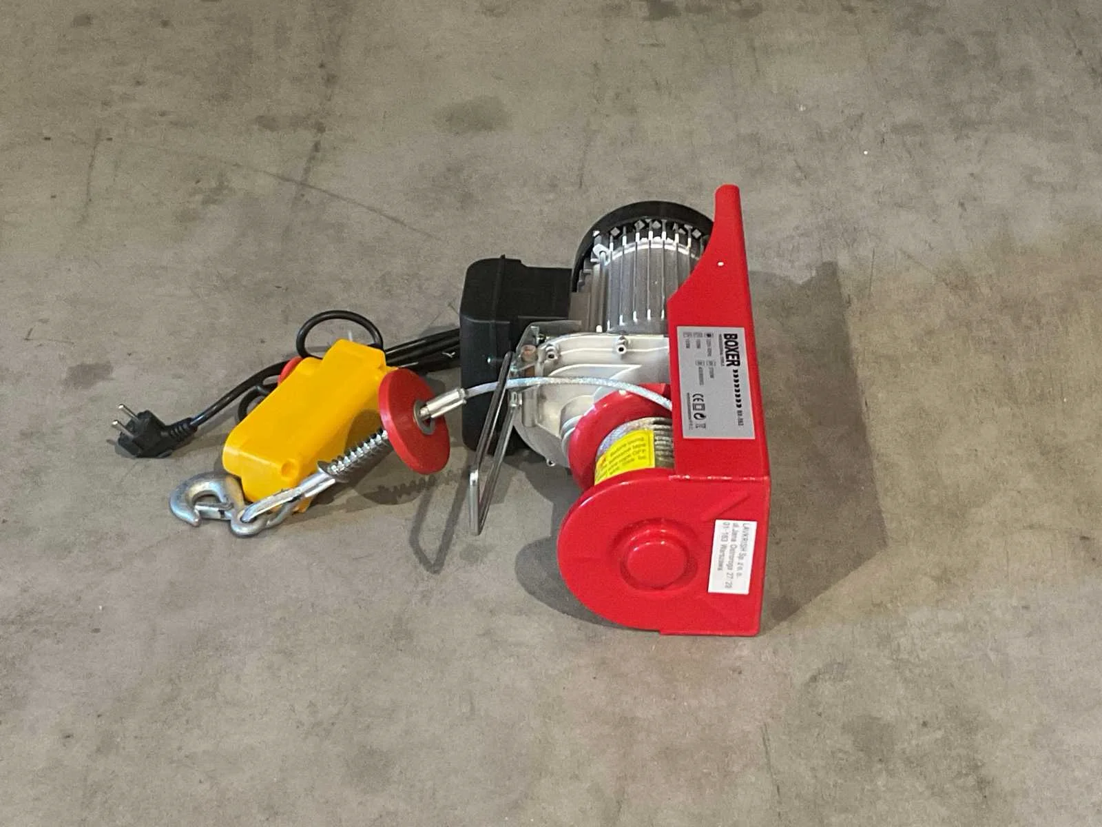 Voorzien van katrol; Motorvermogen: 2700 W; Maximale Laadcapaciteit (enkel / dubbel-kabel): ca. 400kg / 800kg; Maximale Hefhoogte (400kg / 800kg): 12m / 6m; Gem. hijssnelheid: 10 m/min;Aansluiting: 230V; 1 x elektrische lier; 1 x katrol met haak; 1 x montagebeugels; 1 x Bekabelde afstandbediening 1,45; Ongebruikt in doos (Afmeting transport verpakking 430x190x260 mm lxbxh, gewicht 18.30 kg) Merk: Boxer Type: BX-563 800kg Bouwjaar: 2025 Capaciteit.: 800kg Hijshoogte: 12m Afstandsbediening: true Aansluiting: 220V Totale afmeting L: 430mm Totale afmeting Breedte: 190mm Totale afmeting Hoogte: 260mm Eigen gewicht: 18.3kg