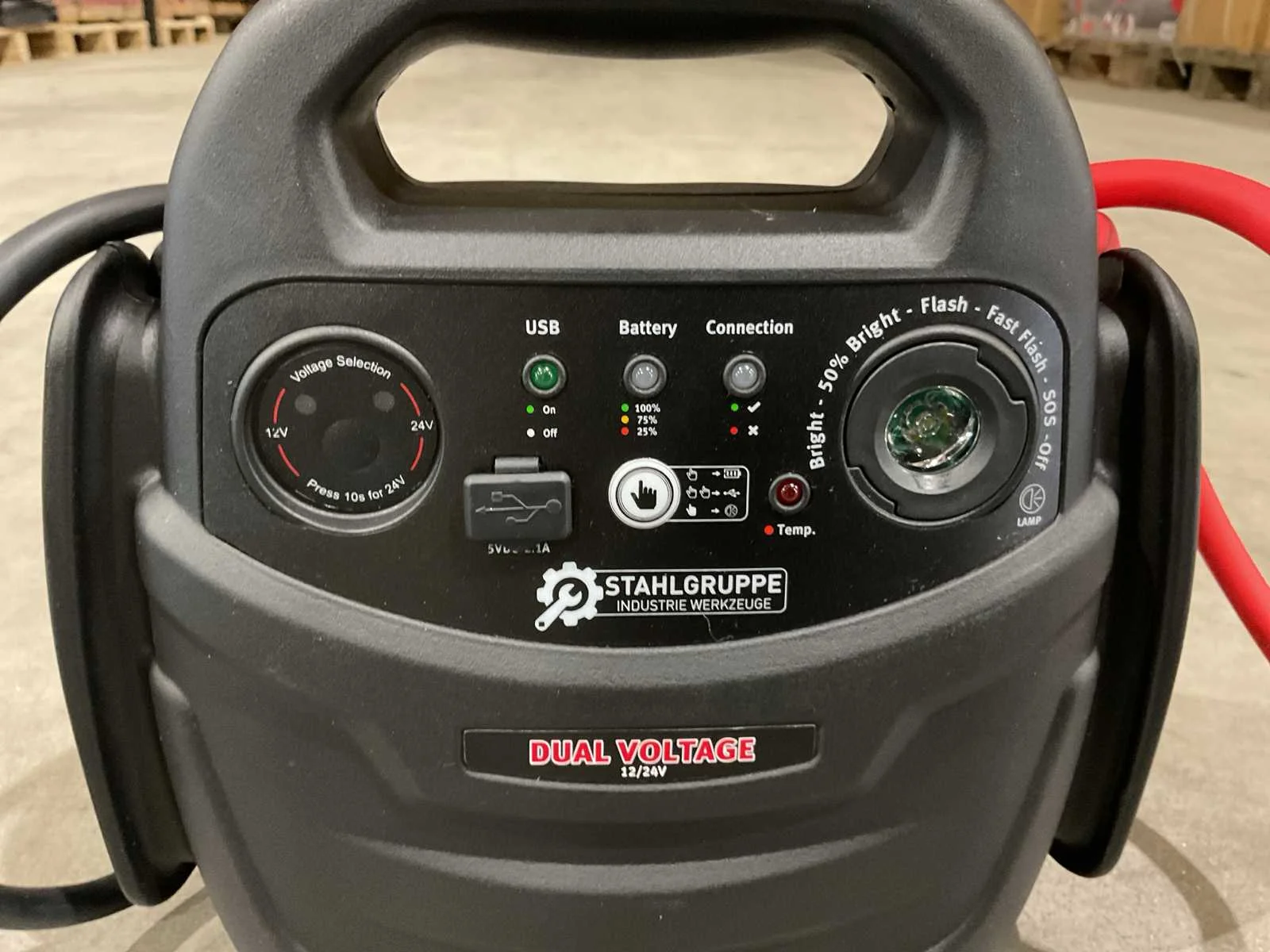 Voorzien van USB lader; led werklamp; 12V 600A/1200A; 24V 400A/900A; ongebruikt in doos Merk: Stahlgruppe Type: 1200A Bouwjaar: 2025 Laadstroom: 1200A Aansluiting: 230V Totale afmeting L: 130mm Totale afmeting Breedte: 250mm Totale afmeting Hoogte: 250mm