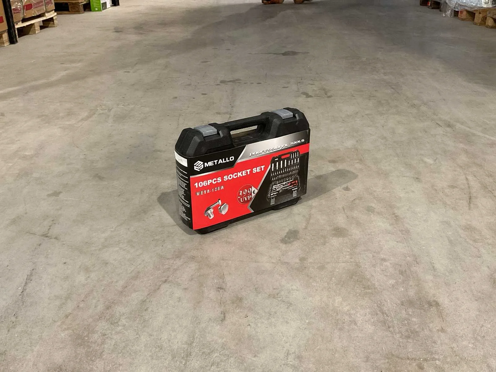 Voorzien van 13 x doppenset DR6PTREG maten 4-4,5-5-5,5-6-7-8-9-10-11-12-13-14; 8 1/4” DR6PT diepe doppen maten: 6-7-8-9-10-11-12-13; 3 x 1/4” DRBIT Doppen: FD 4-5,5-7; 2 x 1/4” DRBIT Doppen: PH1-PH2; 2 x 1/4” DRBIT doppen: PZ1-PZ2; 4 x 1/4” DRBIT Doppen: HW 3-4-5-6; 6 X 1/4” DRBIT Doppen: TX 8-10-15-20-25-30; 1 X 1/4” Doppenadapter; 1 x 1/4” DR Ratelsleutel; 2 x 1/4” DR verlengstuk 2”-4”; 1 x 1/4” verstelbare t sleutel; 1 x 1/4” DR universele koppeling; 1 x DR Spinnersleutel; 1 x DR Flexibele spinner sleutel; 18 x 1/2” DR6PTREG doppen: 10-11-12-13-14-15-16-17-18-19-20-21-22-23-24-27-30-32; 4 x 1/2” DR6PTDEEP doppen: 14-15-17-19; 2 x 1/2” DREXTENTION: 5-10’; 2 x 1/2” Bougie sleutel 16-21; 1 x 1/2” DR Universele koppeling; 1 x 1/2” DR 8 Hexagon bit koppeling; 1 x 3/8” Fx1/2”M 3weg adapter; 5 x inbussleutel 1,5-2-25 25-bits; kunststof koffer; Ongebruikt in doos Merk: Metallo Met koffer: true Delig: 106 Type: Meta-106W Bouwjaar: 2025