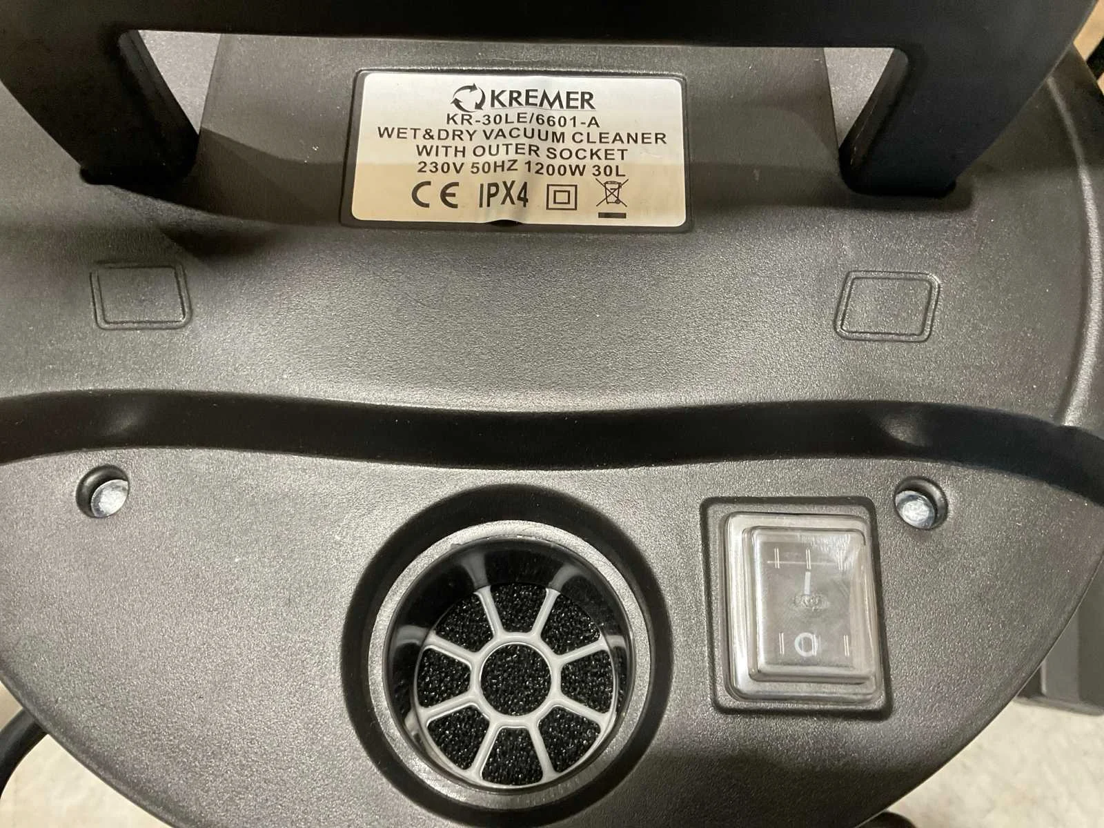 Voorzien van; 4 zwenkwielen; 230 V 50Hz; 1200W; 17kPa; Extra stekker aansluiting 2000W; 4mtr stroom kabel; 30ltr tank capaciteit; 1,5 meter stofzuigerslang; RVS tank; Zuigmond; Hoeken zuig accessoire; Opslag voor meegeleverde accessoires; Ongebruikt in doos (Afmeting transport verpakking 345x340x570 mm lxbxh, gewicht 18 kg) Merk: Kremer Type: KR30LE Bouwjaar: 2025 Vermogen: 1200W Zakloos: true Nat/droog zuiger: true Stopcontact: true Aansluiting: 220V